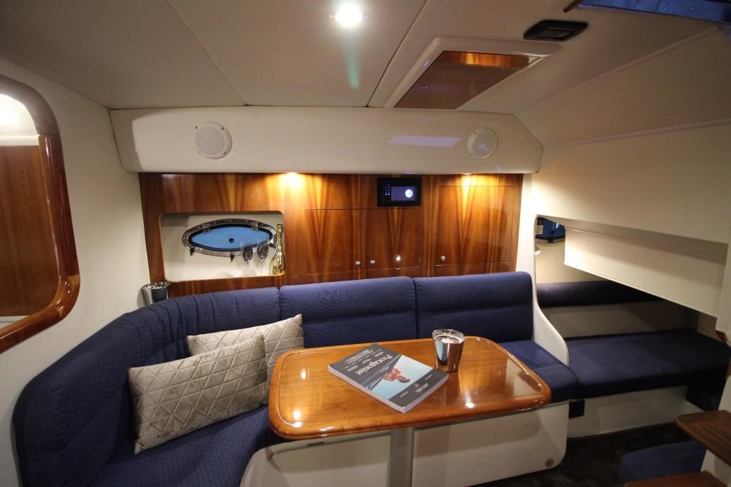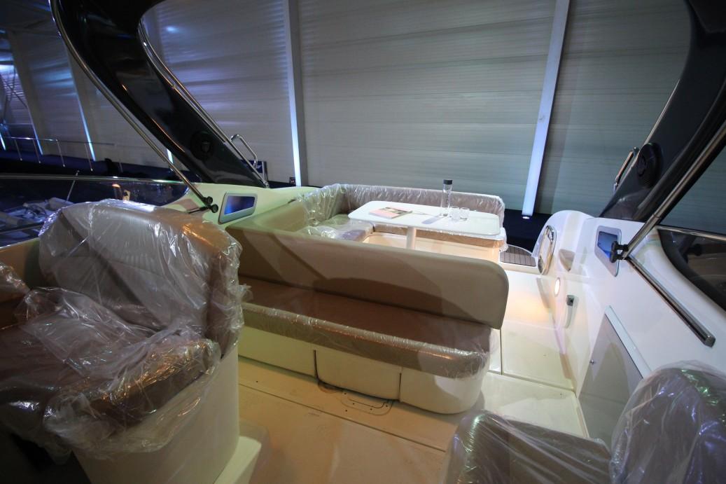 A helm seat with good 360 degree view up front and behind a full beam U-shaped seating area where you can sit with at least 8 guests in comfort. The fully hydraulic adjustable cockpit table can be positioned in any desired height with the touch of a button and thus ensures pleasant dining with a fully opened table at dining height or you just set it lower for usage as a lounge bar cocktail table.