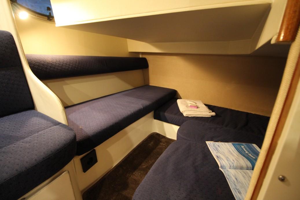 The owners cabin is placed traditional wise in her bow and has a good sized double berth that is accessible from the front. Multiple storage lockers left and right of the berth.
