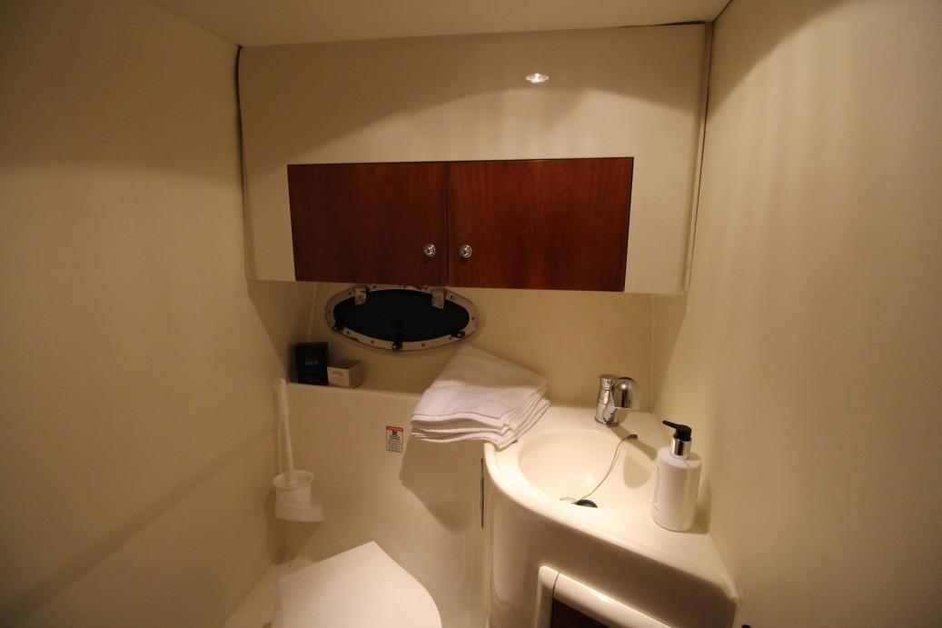 The electric marine toilet with macerator is hidden under a grp lid, furthermore you find a well sized marble top sink and plenty of storage.