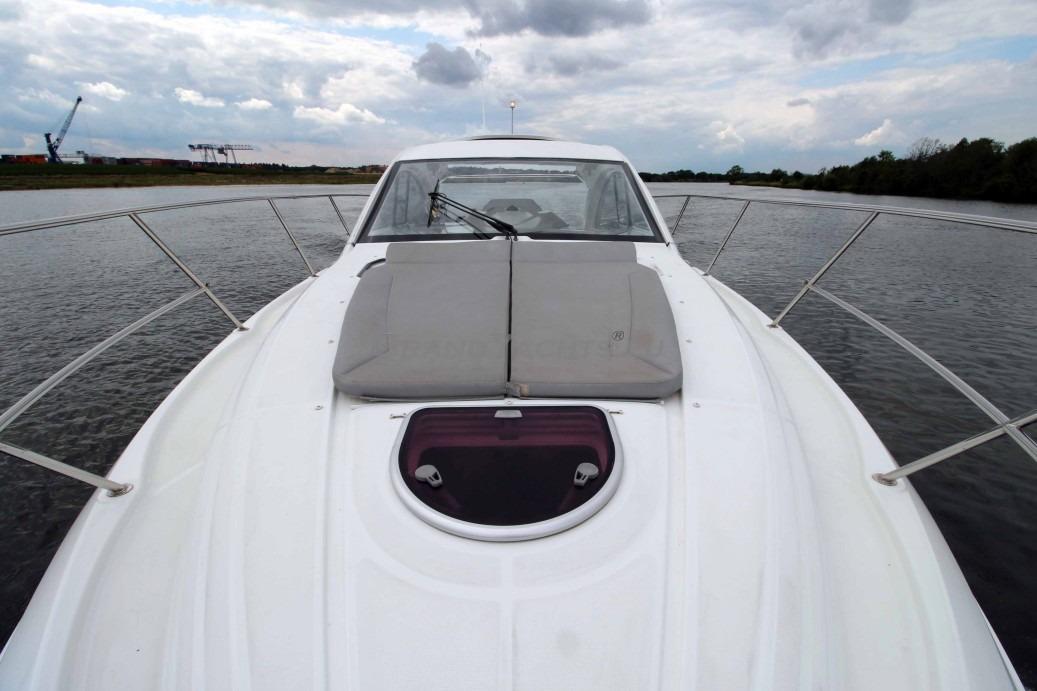 The swim platform measures 3.0 m from side to side. The side decks are quite easy to access thanks to two steps from the cockpit and a very conveniently located handrail mounted to the aft end of the hardtop. There are no rails along the hardtop, but there is a molded-in groove that serves the purpose of keeping you secure in conjunction with the 63.5 cm high side rails.