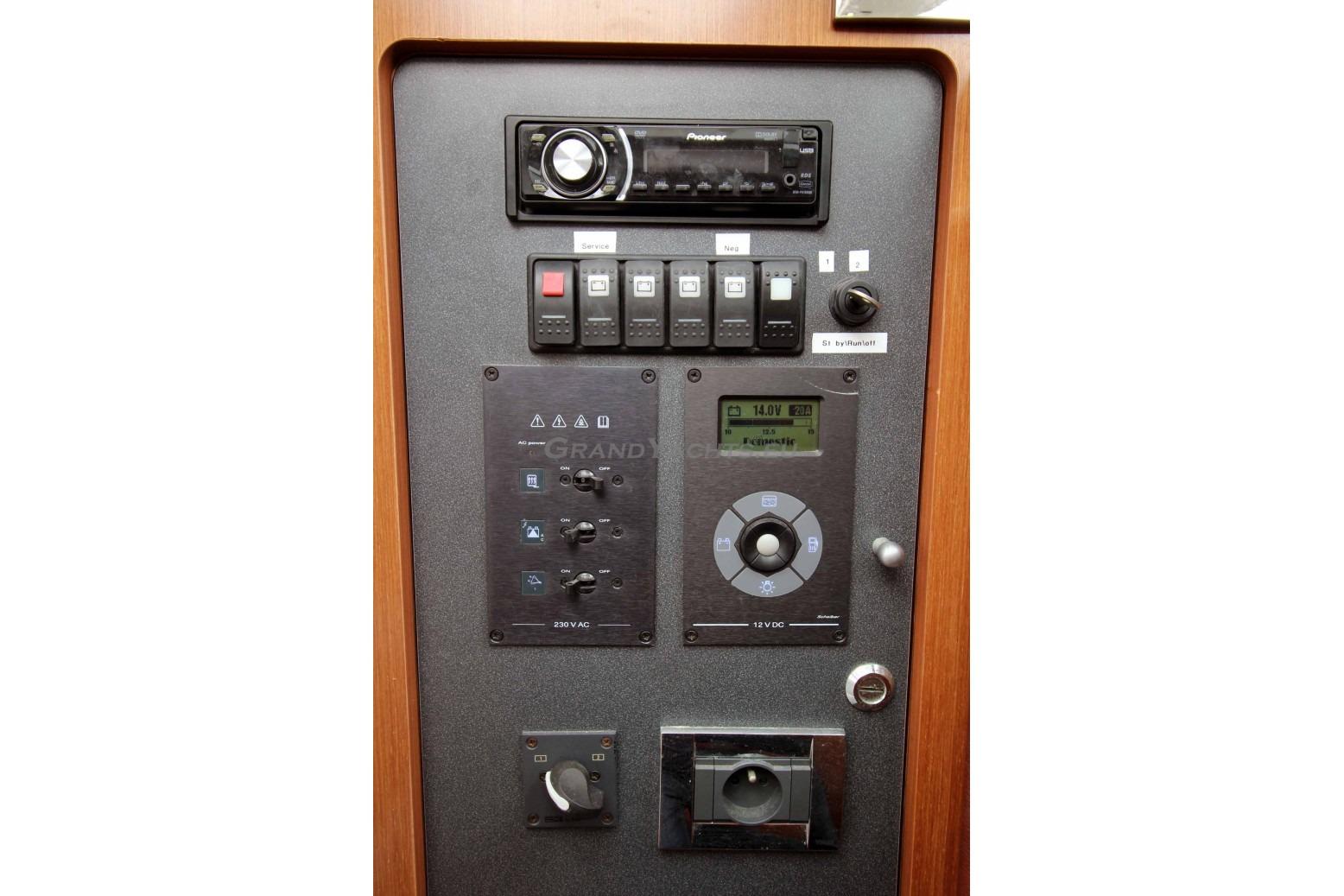 I notice that Beneteau did a great job of adding natural light to the cabin with a massive piece of smoked glass just ahead of the helm console. At left of the companionway is the ship's electrical panel and stereo. Immediately I noticed that there's plenty of storage in the salon, including a shelf behind the settee for quickly tossing items in, like a good book.