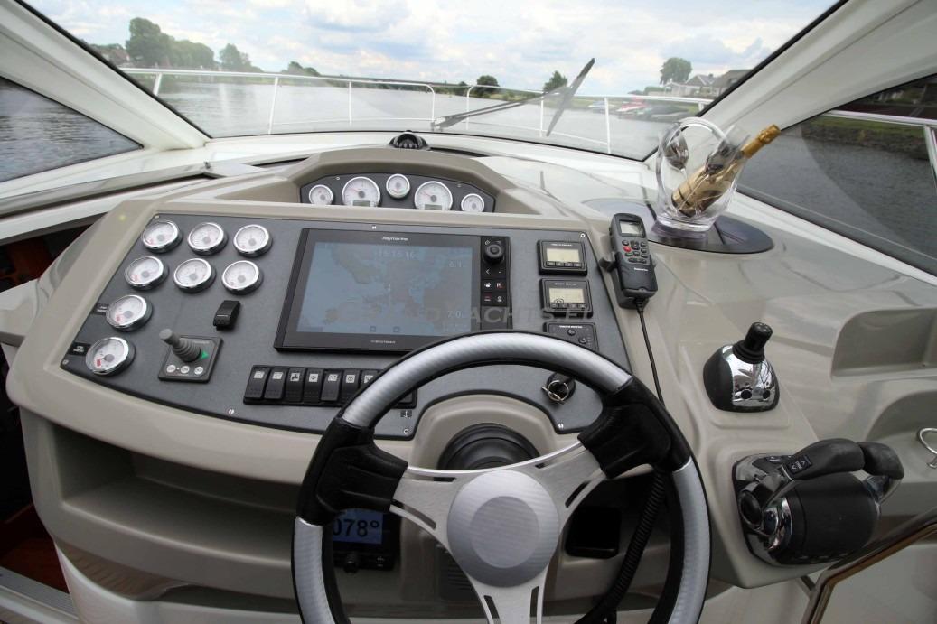 With a single piece thick safety glass windshield, there's great visibility directly forward. Notice the large bow and the high safety rails carry well aft. Our boat has the newest Raymarine Axiom display with chart plotter, HD- radar and forward looking sonar. A Raymarine autopilot from the latest series is fitted as well.