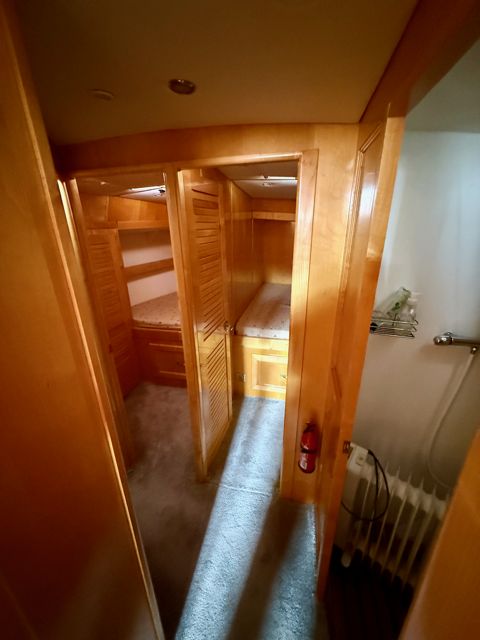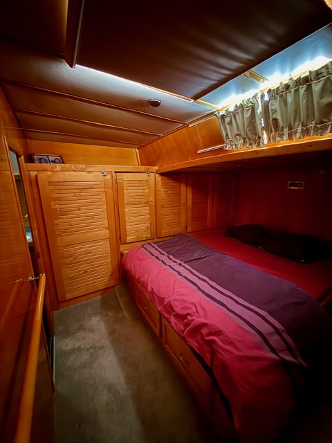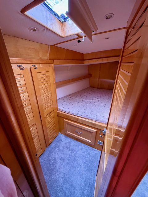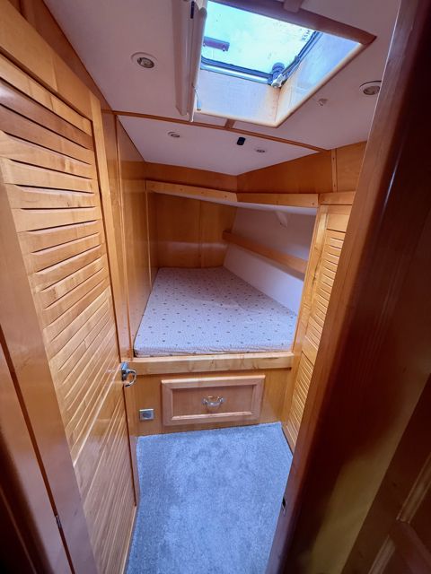 Interior Layout — sycamore maple finishes 3 double cabins (including one very large aft cabin) + 1 single cabin — 2 heads with electric toilets — Separate shower — Bright and spacious saloon — U-shaped galley — Large aft storage — Full nav station