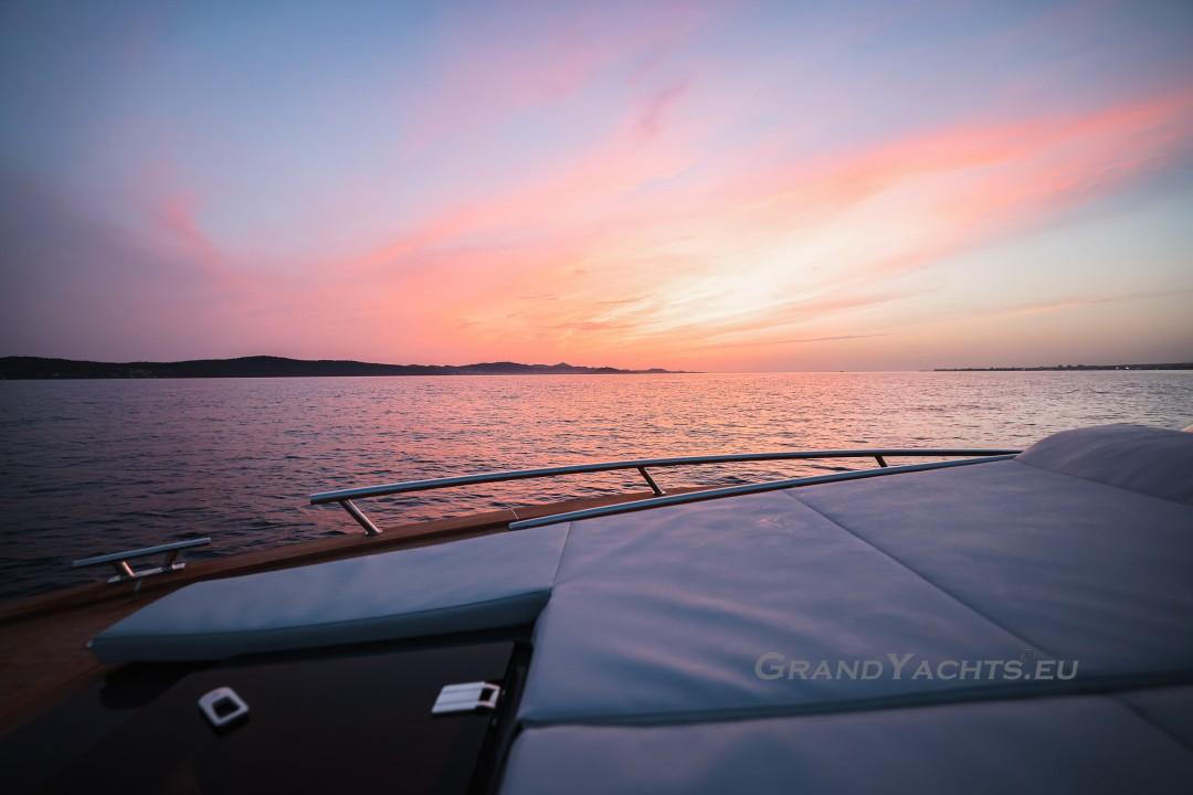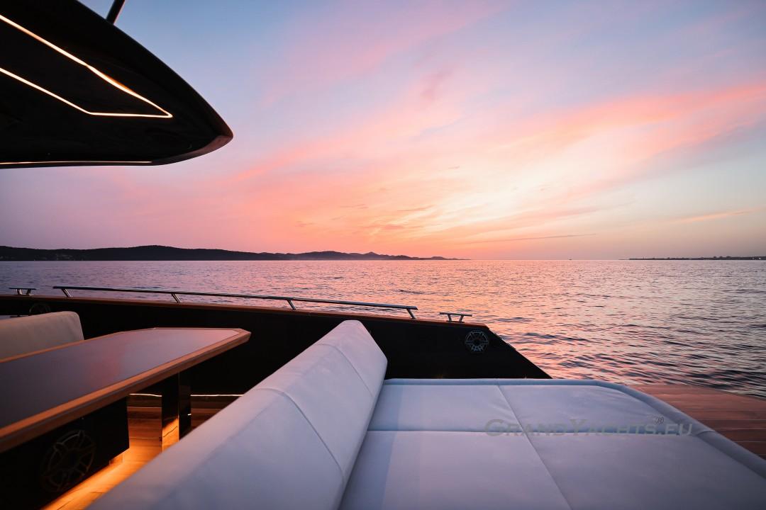 Swim platform The first thing you’re going to notice when you come on board this ship, hell, you’ll probably notice it before coming on board, is the immense, solid teak swim/stern platform. The combined integral/add-on platform can be hydraulically raised and lowered. The projected length abaft the transom is huge for a ship of this size, improving safety as well as liveability. Moreover, this makes the platform ideal for storing any tender or jet ski.