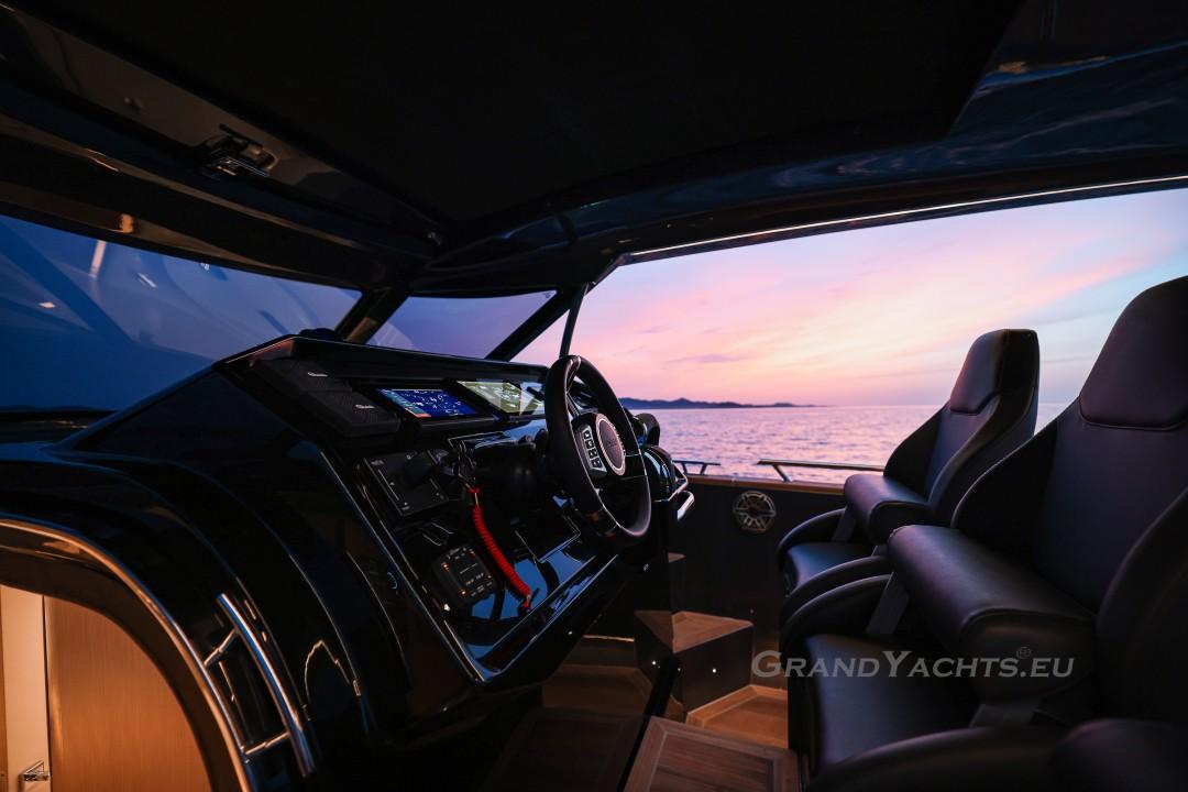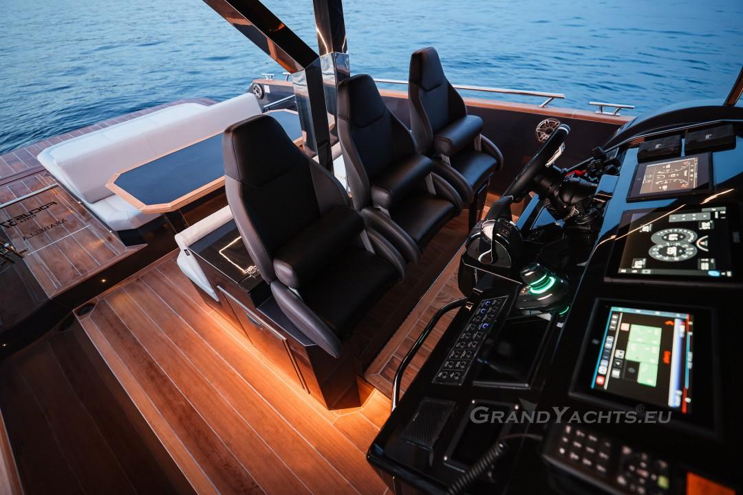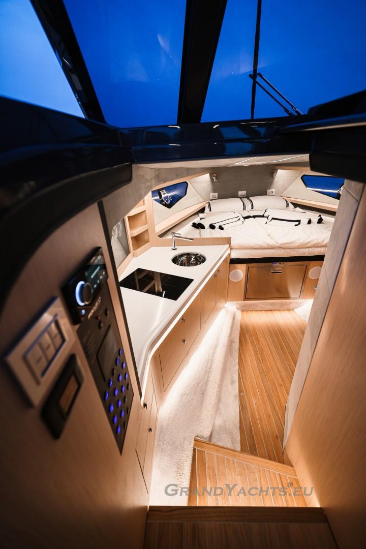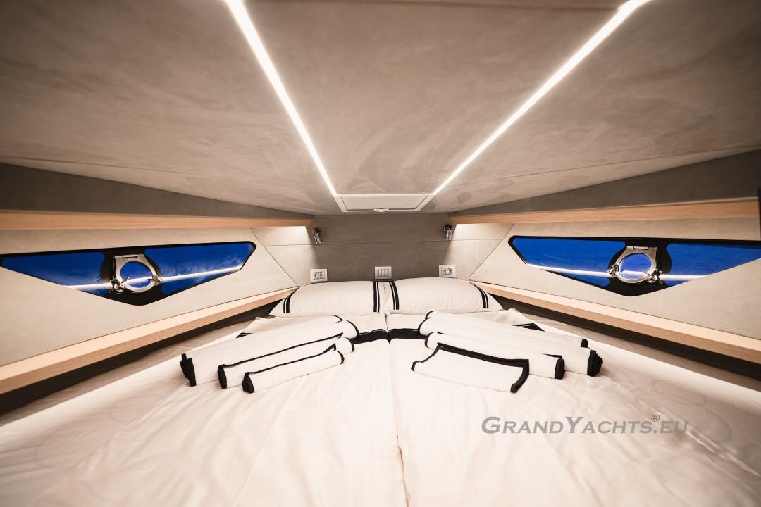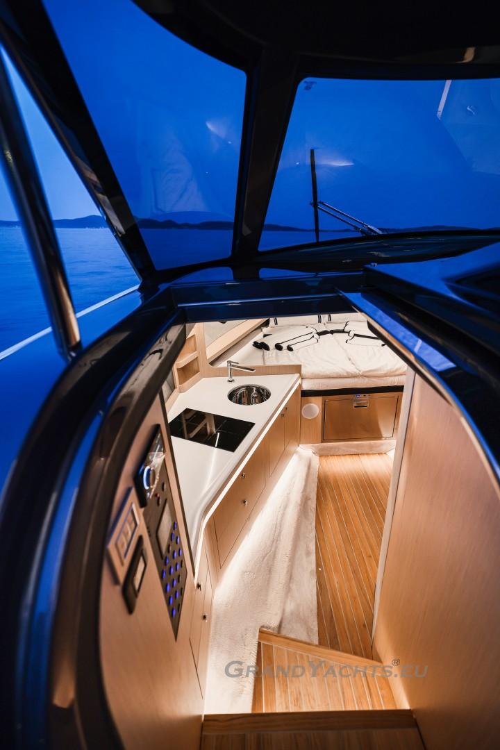 Cockpit Walking at level from the stern platform leads you into the large, open cockpit. You’ll immediately notice two major features: the first being an almost abnormal level of attention to detail and finish I like to call ‘The Focus Touch.’ The second thing is the strong spatial effect, mostly due to the unrestricted fore-and-aft movement and the wraparound hardtop screen, providing unrestricted vision anywhere in the cockpit. Directly aft is an extended sunbed both spacious and comfortable, an indispensable feature on any open sports cruiser. Take a couple more steps forward and you’ll be standing in front of a well-built wet bar which is nearly invisible in closed position. Lift the high-gloss kerrock counter to reveal a stainless steel sink and faucet, as well as an electric grill. The open-air galley also includes storage space, a compartment for litter and space for a wine-cooler. The aft side of the cockpit houses a six-man dining station with an adjustable wood-and-steel table. The sunpad area is stretches along the aft side, which, in conjunction with the non-rounded corners, provide the ultimate lounging experience. It's hard to talk about the cockpit without mentioning the helm. The console is raised compared to the rest of the cockpit, which is essential for good vision as well as being aesthetically pleasing. The vessel is operated from the centre of the three marine-grade, double stitched leather bucket seats, facilitating unimpaired movement for the observer. The solid teak sliding footrests are a very welcome addition, improving comfort while simultaneously being pleasing to the eye. The digital steering wheel is not only mesmerizingly beautiful, but adjustable as well to suit your preferences. The high-gloss, gel coated black dashboard is a dream come true for any captain, housing a bevy of state-of-the-art instruments. A raised panel below the compass contains all the digital engine gauges, as well as the alarm lights. Various waterproof switches are also present, as well as a 12 V USB socket. A rudder angle indicator and a Tridata (Depth / Speed / Trip) display are also standard equipment.