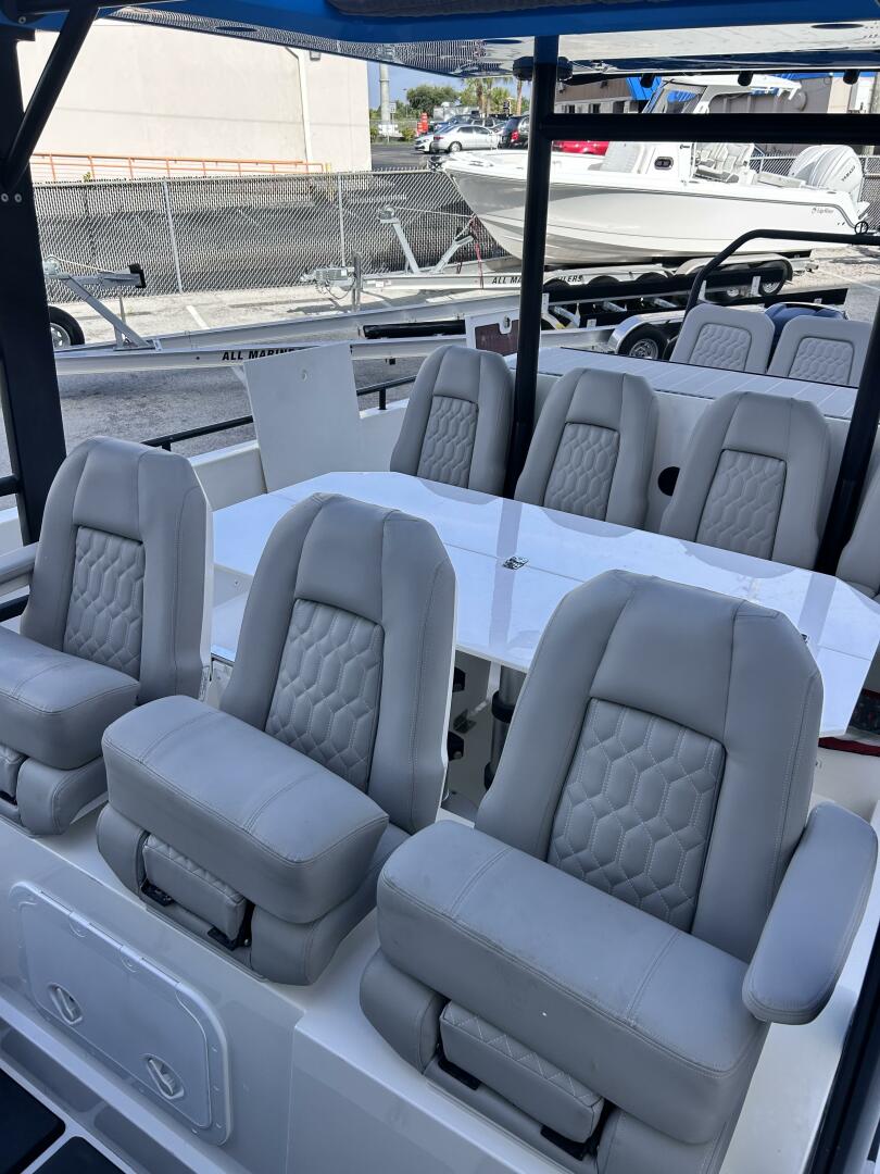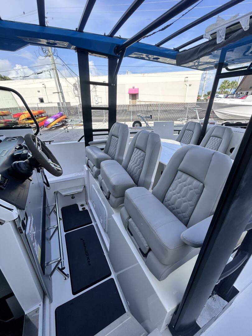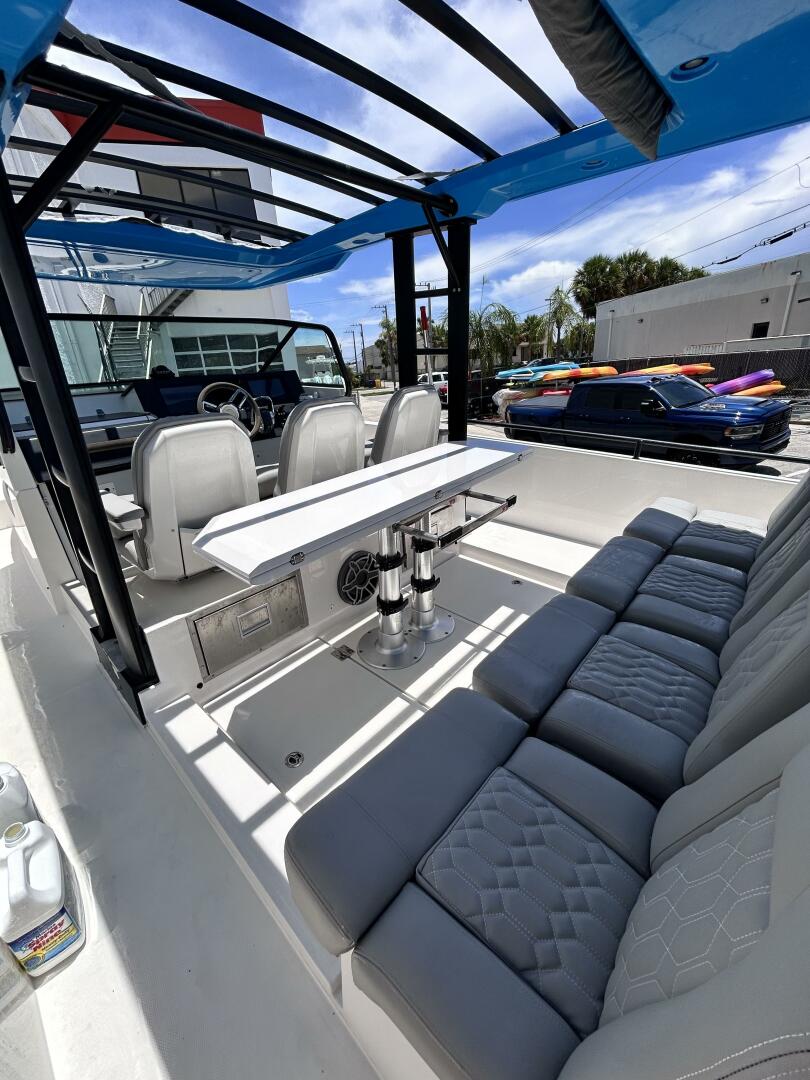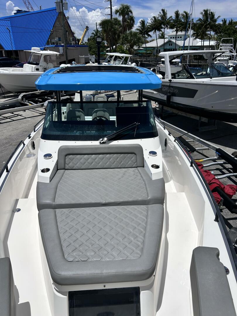 This vessel features the Brabus line trim package with Miami Blue hull color and the retractable Sunbrella canvas T-Top. Electronics include Garmin GPSMap 1222 Touch, Sonar Module Garmin with DownVu/SideVu, the Garmin VHF300i, and the upgraded Fusion Audio unit. Other notable features include 120V shore power, and bow thrusters.