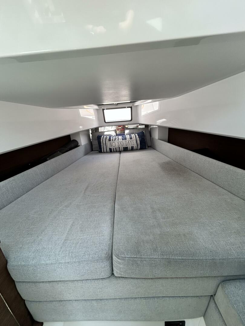 The forward cabin entryway is located at the helm. The cabin features a V-berth to accommodate two, a berth curtain, a bench seat, a sink with a cabinet, storage cabinets, courtesy lights, wood floor, blinds, and a toilet that is hidden by a folding cushion to create a bench seat.