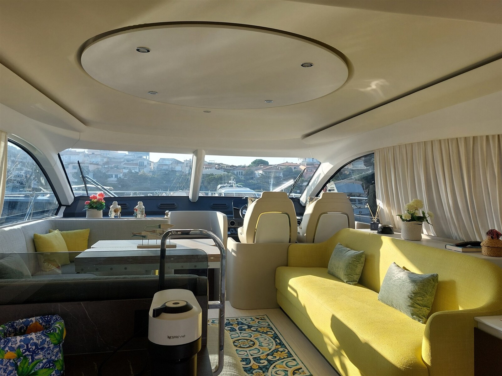 Bimini (Elettroidraulico sul fly), Cojinería completa (Batyline grey), Cojines de proa, Cortinas Opacas, Cubre ventanas, Lona de Flybridge, Funda cónsola, Funda asientos, Toldo (Privacy di poppa), Mosquiteras.