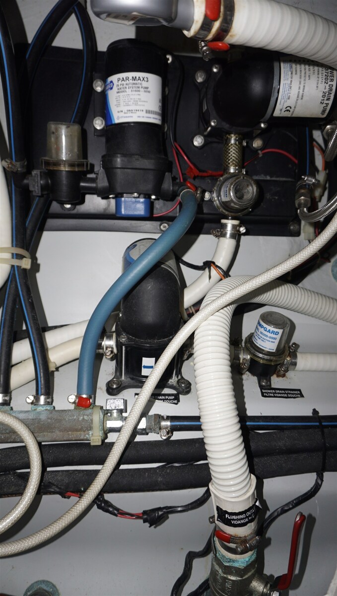 Motoralarm, Anker (ROCNA 10 kg), Druckwasserpumpe, Batterien (2024 160 Ah + 80 Ah), Landstromkabel, Cockpitdusche, Plattform, manuelle Bilgepumpe, Landanschluß, Rectifier, elektrische Ankerwinde (800W), Badeleiter, Windex.
