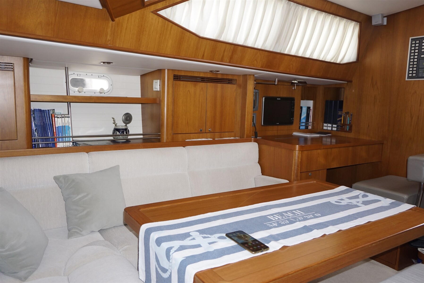 Barril de madera con tira de acero inoxidable, reflector de radar CYCLOPS II, luz estroboscópica y luz tricolor en la cabeza del árbol, todos los ojos de buey con persianas y mosquiteras, hélice GORI de 3 palas, extractor de humos en la cocina,