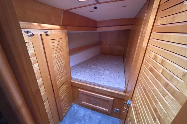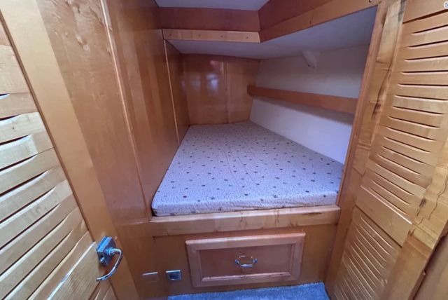 Interior Layout — sycamore maple finishes 3 double cabins (including one very large aft cabin) + 1 single cabin — 2 heads with electric toilets — Separate shower — Bright and spacious saloon — U-shaped galley — Large aft storage — Full nav station