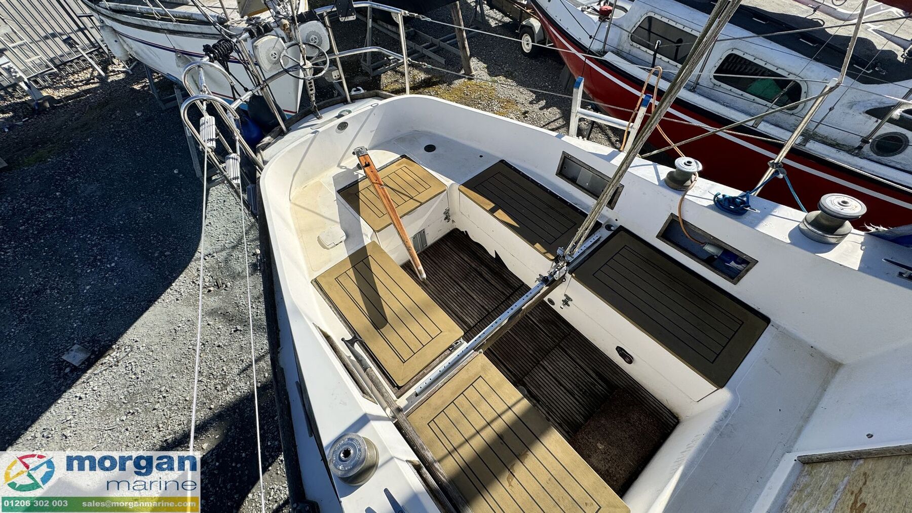 Cockpit: Skeg hung rudder with tiller steering. Painted GRP deck, superstructure and draining aft cockpit. Port and starboard teak decking bench seating with cockpit lockers. In hull cockpit cut out storage areas. Lazarette stern locker. Slide out washboards door for saloon access. Cockpit grating floor.