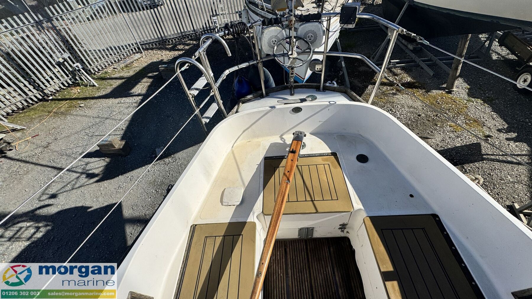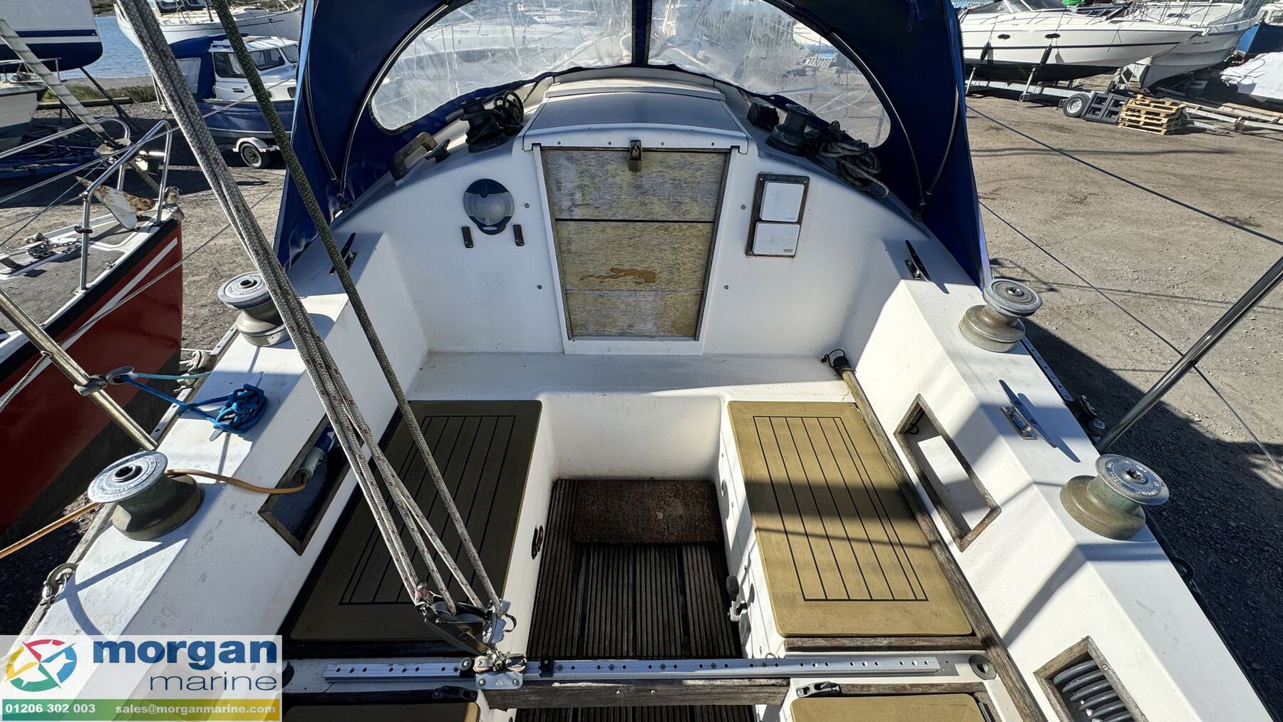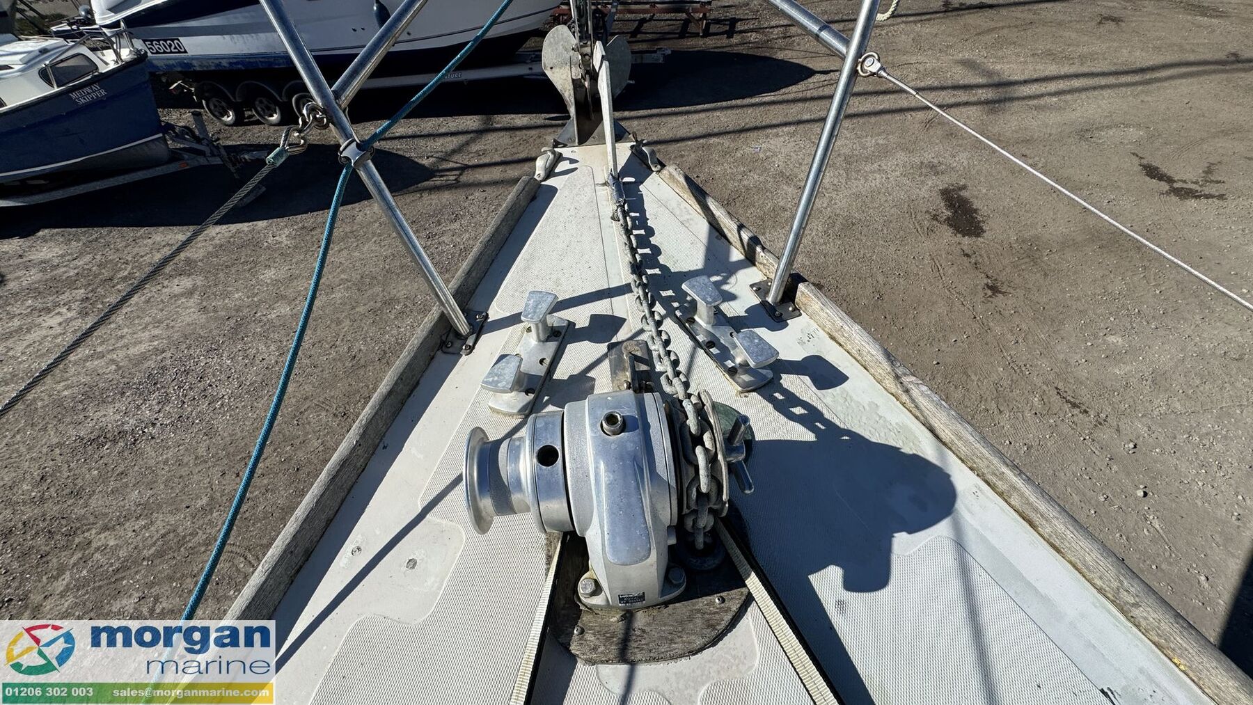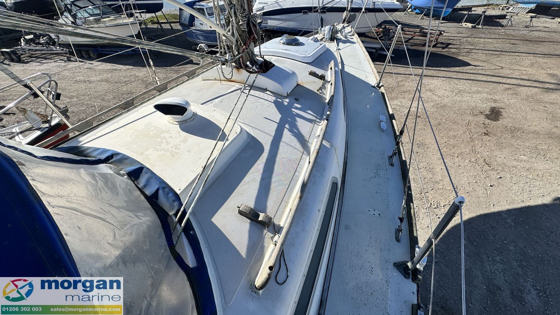 Deck: GRP hull. Cast iron fin keel. Electric windlass with Lofrans Royal anchor, bow roller, chain and rope. Main spray with cover 160 sqft. Furling Genoa - 305 sqft. 2 jibs. Stainless Steel pulpit and Pushpit, stanchions and guard rails. 2x Lewmar 40 genoa winches. 2x Lewmar 25 secondary winches. Lewmar 25 and Barton winch on coach roof. Antal 16 winch on mast. Deck stepped masthead sloop. Gold anodised alloy single spreader mast and stab / roller boom. Facnor C30 roller furling headsail gear. 1x 19 Stainless Steel standing rigging - age unknown. Wheel type backstay tensioner. Terylene running rigging. Removable boarding ladder. 2x Tannoy ventilators. Alloy Genoa tracks with roller cars, X section main sheet track with traveller and adjusting tackles. Mooring cleats. Teak coach roof grab handles. Fenders and lines. Boat hook. Blue cockpit spray hood.