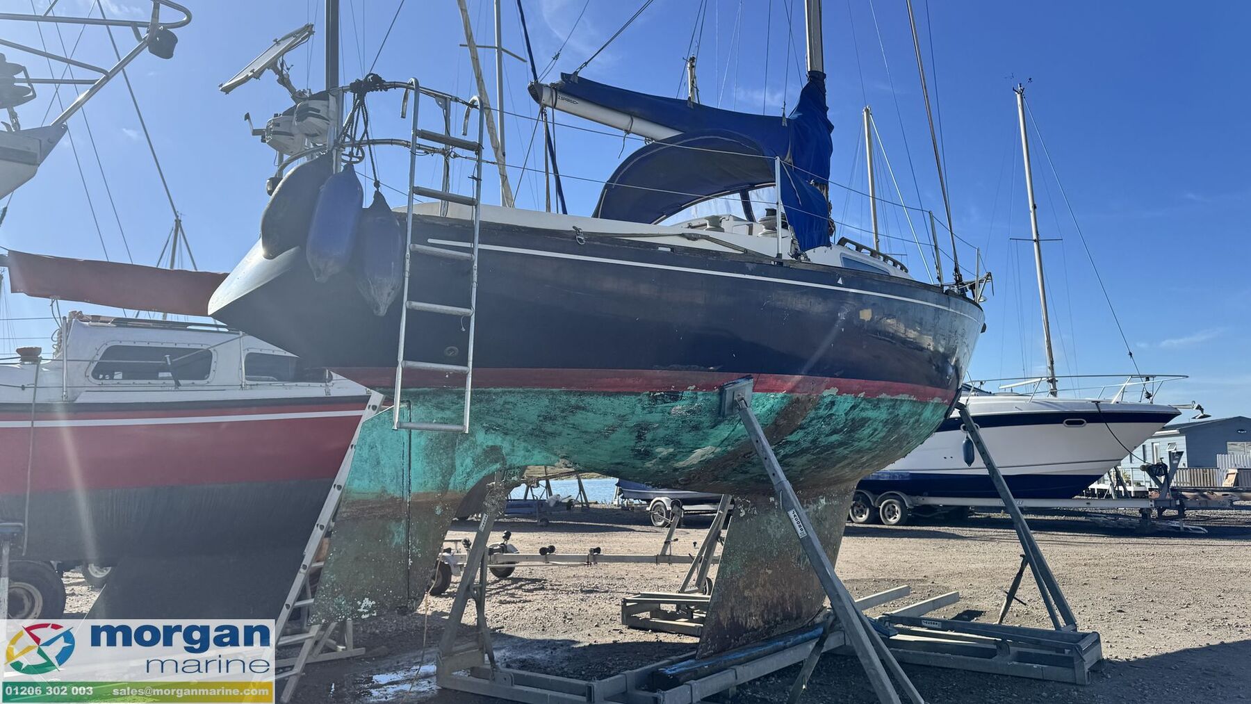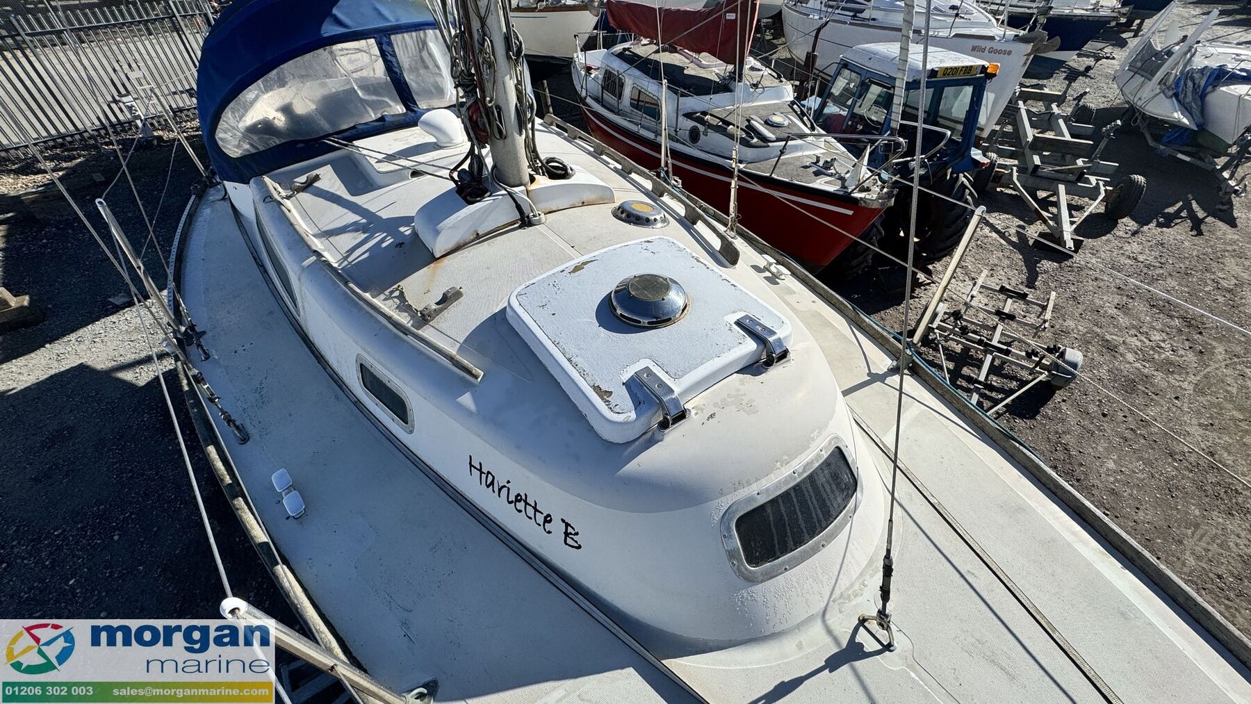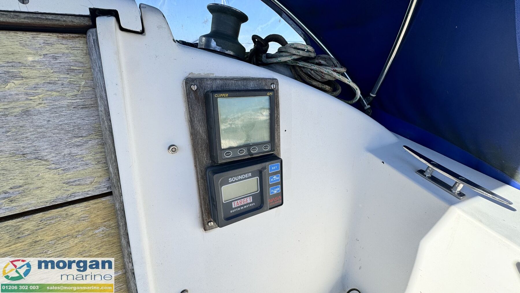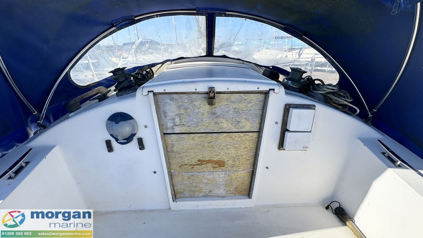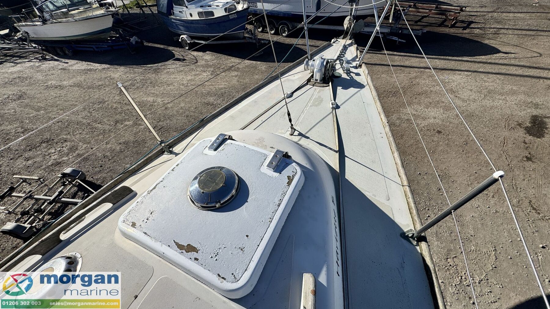 Deck: GRP hull. Cast iron fin keel. Electric windlass with Lofrans Royal anchor, bow roller, chain and rope. Main spray with cover 160 sqft. Furling Genoa - 305 sqft. 2 jibs. Stainless Steel pulpit and Pushpit, stanchions and guard rails. 2x Lewmar 40 genoa winches. 2x Lewmar 25 secondary winches. Lewmar 25 and Barton winch on coach roof. Antal 16 winch on mast. Deck stepped masthead sloop. Gold anodised alloy single spreader mast and stab / roller boom. Facnor C30 roller furling headsail gear. 1x 19 Stainless Steel standing rigging - age unknown. Wheel type backstay tensioner. Terylene running rigging. Removable boarding ladder. 2x Tannoy ventilators. Alloy Genoa tracks with roller cars, X section main sheet track with traveller and adjusting tackles. Mooring cleats. Teak coach roof grab handles. Fenders and lines. Boat hook. Blue cockpit spray hood.