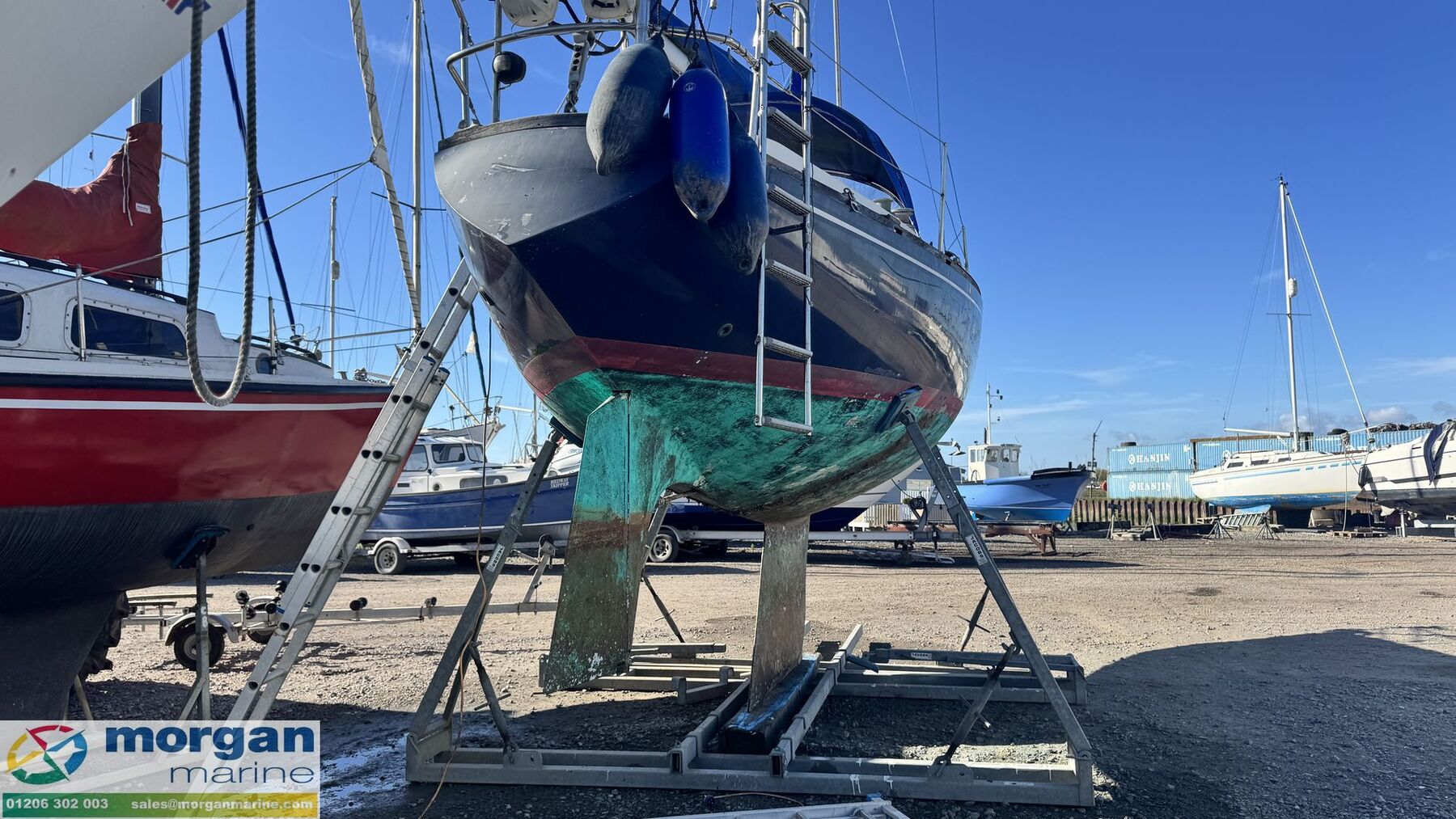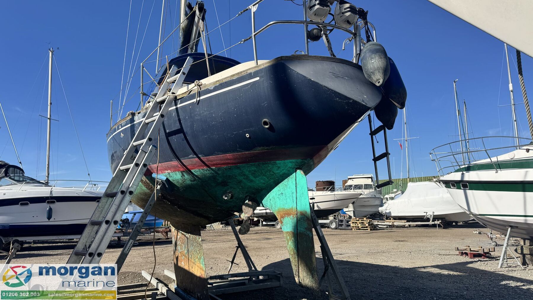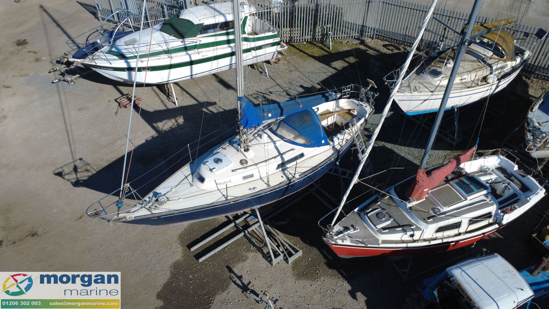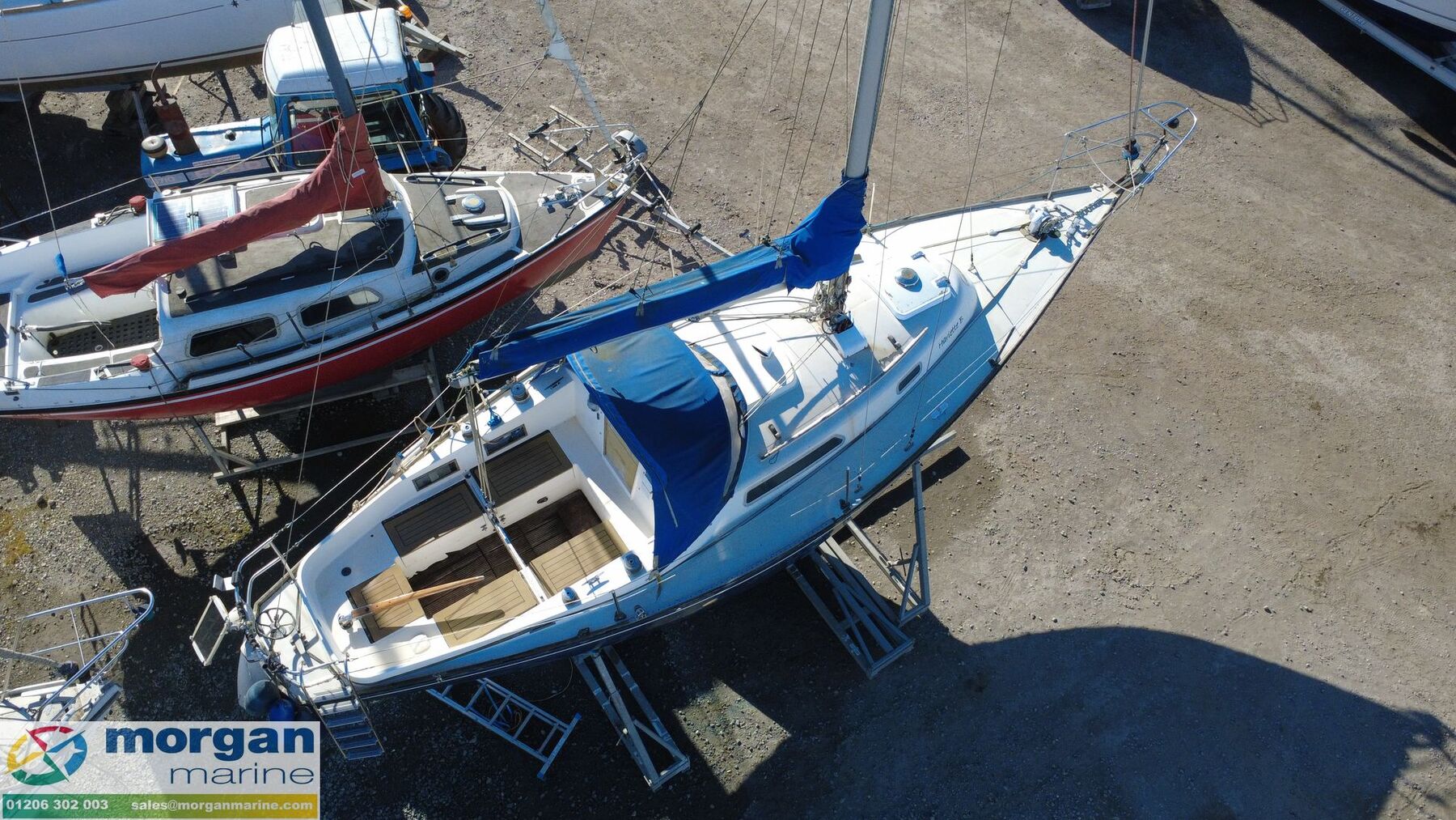Deck: GRP hull. Cast iron fin keel. Electric windlass with Lofrans Royal anchor, bow roller, chain and rope. Main spray with cover 160 sqft. Furling Genoa - 305 sqft. 2 jibs. Stainless Steel pulpit and Pushpit, stanchions and guard rails. 2x Lewmar 40 genoa winches. 2x Lewmar 25 secondary winches. Lewmar 25 and Barton winch on coach roof. Antal 16 winch on mast. Deck stepped masthead sloop. Gold anodised alloy single spreader mast and stab / roller boom. Facnor C30 roller furling headsail gear. 1x 19 Stainless Steel standing rigging - age unknown. Wheel type backstay tensioner. Terylene running rigging. Removable boarding ladder. 2x Tannoy ventilators. Alloy Genoa tracks with roller cars, X section main sheet track with traveller and adjusting tackles. Mooring cleats. Teak coach roof grab handles. Fenders and lines. Boat hook. Blue cockpit spray hood.