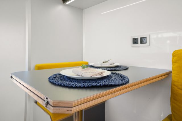 Le salon comprend une table pliante 6 places, sièges modulables, TV LED 32’’, système audio Bluetooth et climatisation réversible.