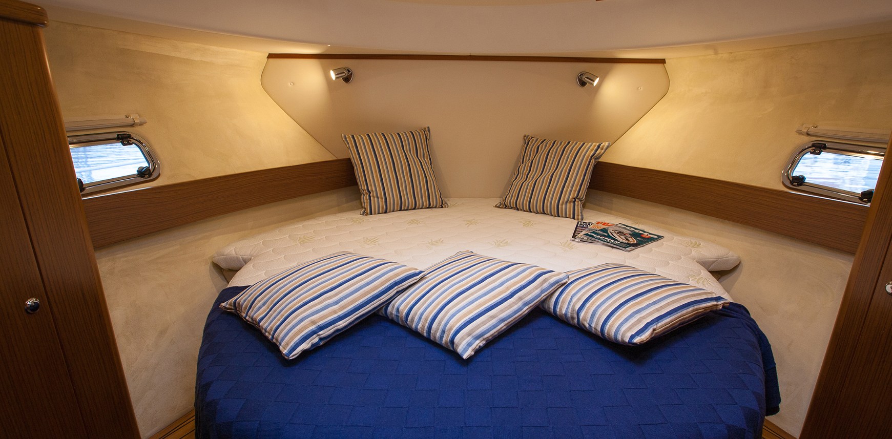 Acqua Calda, Aria condizionata (Domotic doppio ciclo), Boiler (bivalente), Cassaforte, Dimmer per Luci, Impianto acque nere, Indicatore del serbatoio del carburante, Indicatore del Serbatoio dell’Acqua, Indicatore del Serbatoio delle Acque Reflue, Indicatore della pressione dell’olio nel motore, Indicatore della temperatura del motore, Inverter (a pannelli solari), Pavimento interno in legno, Prese interne 12v, Prese interne 220v, Serbatoio Acque Nere, Telecamera, WC marino elettrico.