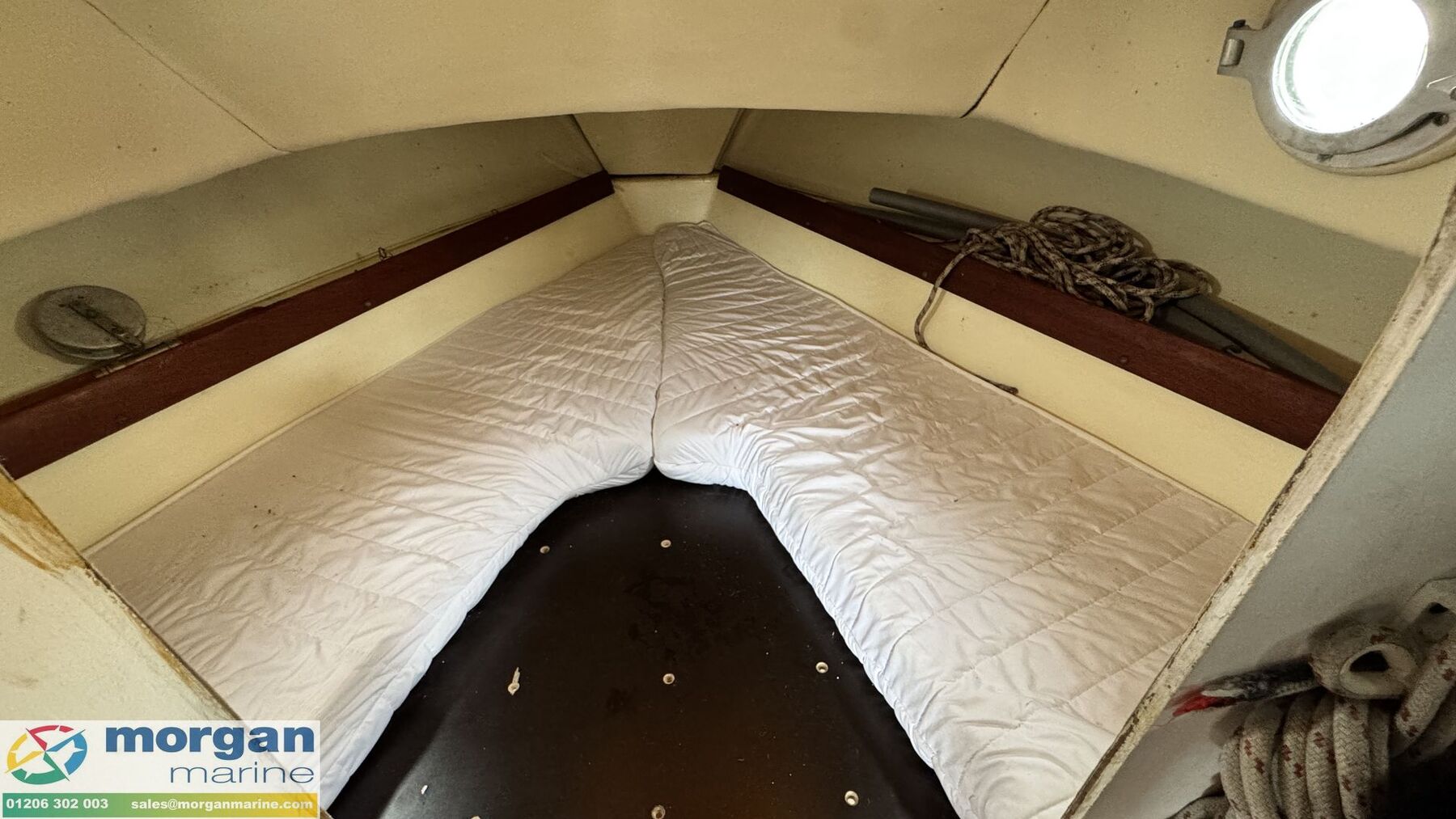 Cabin: Sliding hatch into saloon area. 5 berths. Forward main berth with storage. Port and Starboard single stern berths. Fully galley area with 2 burner grill cooker (brand new - never used), sink with fresh water, and lots of lockers and side lockers. Toilet compartment with Jabsco marine toilet and window. Hatch to deck. Saloon L-shaped cushioned seating. Various cooking and tool sundries. Life Jacket - Expires 2027.