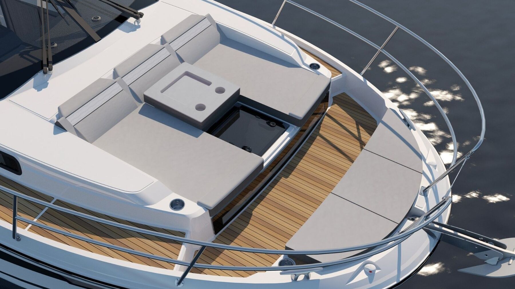 Deck: Electric folding terrace on starboard side. Port side boarding door for easy access to moorings. Electric windlass with anchor and rode in self draining anchor locker + bow roller - with control from helm. Mooring kit: 4x mooring lines (diameter: 16 / length: 12000), 4x fenders (635 x 200). Anchoring kit: anchor – 16kg, chain - 10mm / 28m, cable - 18mm / 40m. Aft cockpit sliding bench forming U-shape saloon with cushions and backrest - convertible into sun lounger + wooden table and sunpad cushion. Deck locker with ladder. 2x forward / 2x aft / 2x midship mooring cleats. Open front pulpits and cockpit handrails. Self draining cockpit. Starboard side cockpit barrier to swim platforms. Cockpit shower (hot & cold water). Hull rubrail. Wide and deep starboard side deck for safe access to wheelhouse helm door and bow. Aft cockpit sun awning + closing canopy – graphite. Bow cockpit with lounger chairs + cushion. Linedeck throughout boat.