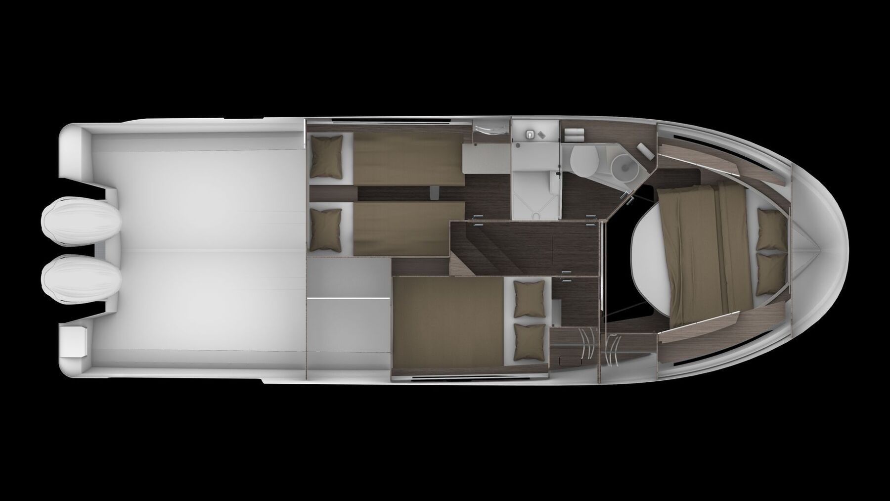 Cabin: Forward cabin with extendable double berth with premium mattress and storage under + headband cushion, roof hatch, hull + deck windows + opening porthole, overhead lockers + shelves + storage, Ambiance LED lighting + reading lights + sockets. Portside cabin with premium mattress - 2x single berths (with double berth complement) + storage under + headboard, seat, locker + storage and bedside table, LED lights + socket. 3rd cabin with LED lights, locker, premium mattress, locker, opening porthole, plus additional 80L fridge. Separate toilet compartment with electric toilet, washbasin, Corian countertop, opening porthole and separate shower. Separate access to the head compartment from the main cabin. Full height mirror in steps down from wheelhouse. Double berth complement in saloon.