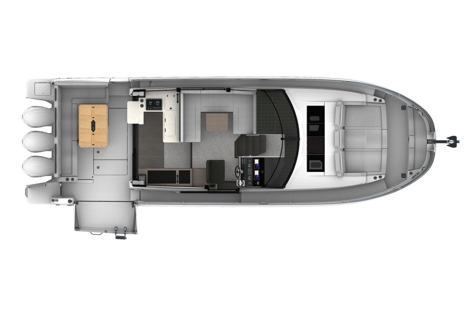 Machinery: Triple Yamaha 300 (white) - Steer By Wire + joystick. Bow thruster for easier manoeuvrability. Zipwake automatic trim tabs. Diesel heating. Manual and electric bilge pumps. Fuel capacity: 1,174L with outside fill. Water capacity: 400L.