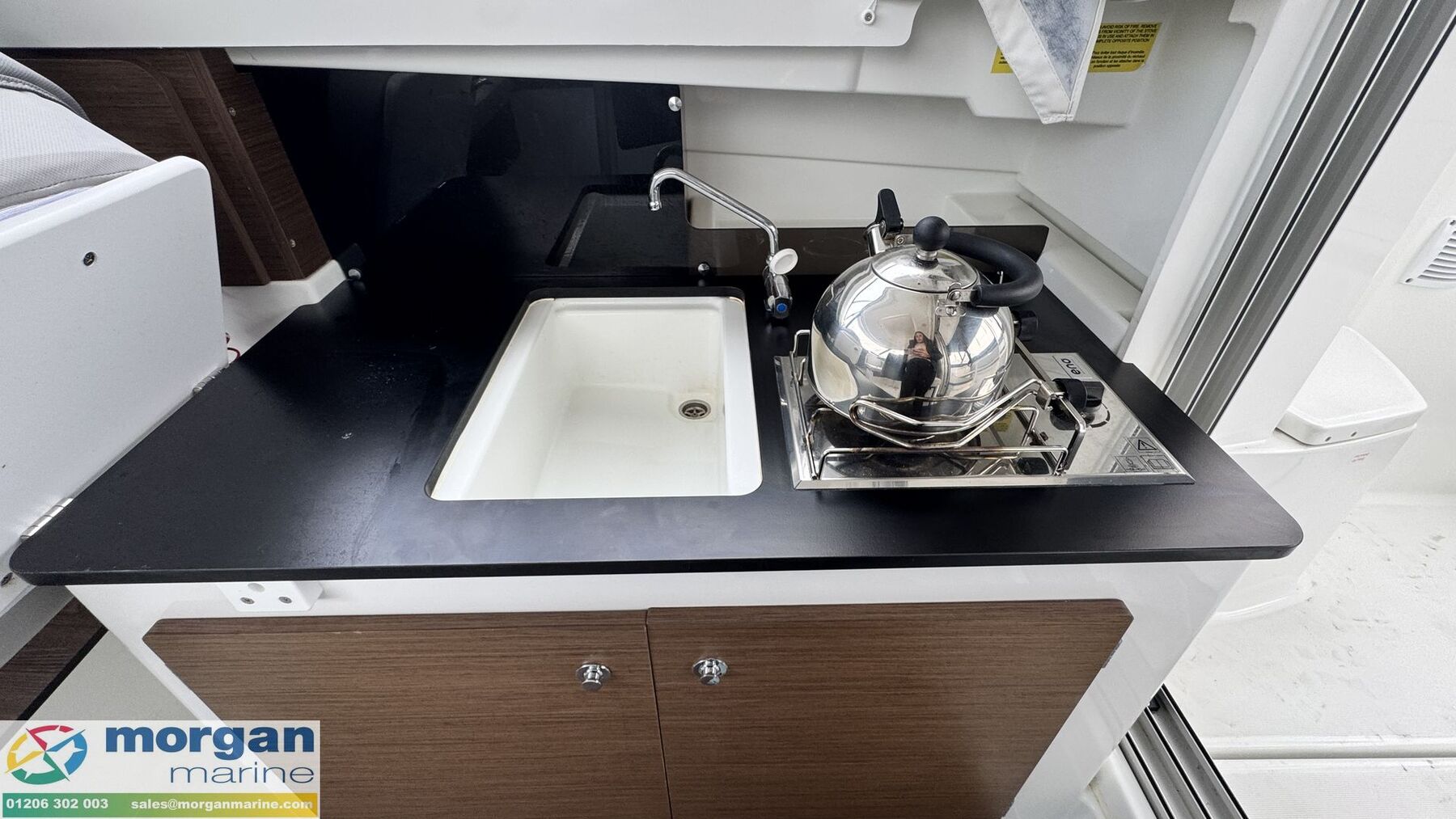 Cockpit: Wheelhouse with aft sliding door, roof hatch and sliding windows on port and starboard sides. Large glass windscreen with port and starboard windscreen wipers + screen wash. Helm position with bolster pilot seat, dash with full engine controls, electronics and compass. Helm seat folds forward for easy access to starboard side luxury galley - with gas stove + gas box, worktop with Arpa black finish, 2x stainless steel glass holders, 42L fridge and sink with electric pressurised water. Port side saloon with table with lockers under seats. Forward facing co-pilot bench seat - converts to seating at table. Wheelhouse interior curtains. Cockpit shower.