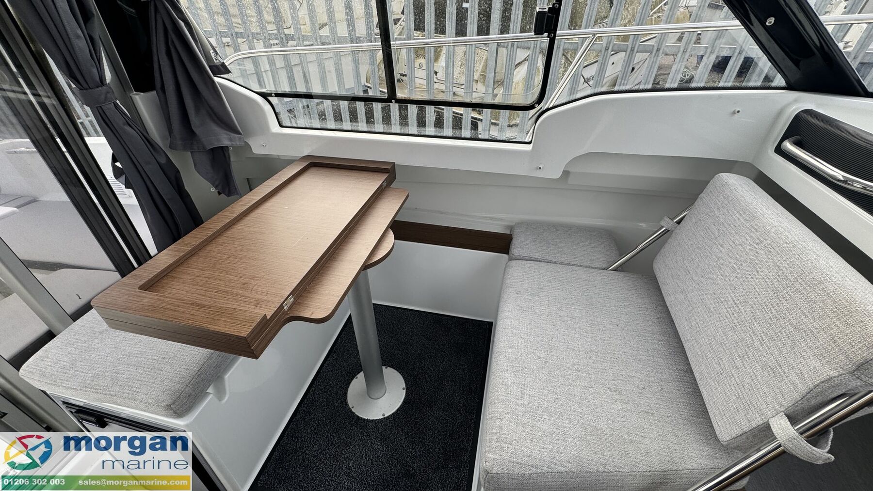 Cockpit: Wheelhouse with aft sliding door, roof hatch and sliding windows on port and starboard sides. Large glass windscreen with port and starboard windscreen wipers (new blades in 2025) + screen wash. Helm position with bolster pilot seat, dash with full engine controls, electronics and compass. Helm seat folds forward for easy access to starboard side luxury galley - with gas stove, worktop with Arpa black finish, 2x stainless steel glass holders, 42L fridge and sink with electric pressurised water. Port side saloon with table with lockers under seats. Forward facing co-pilot bench seat - converts to seating at table. Wheelhouse interior curtains.