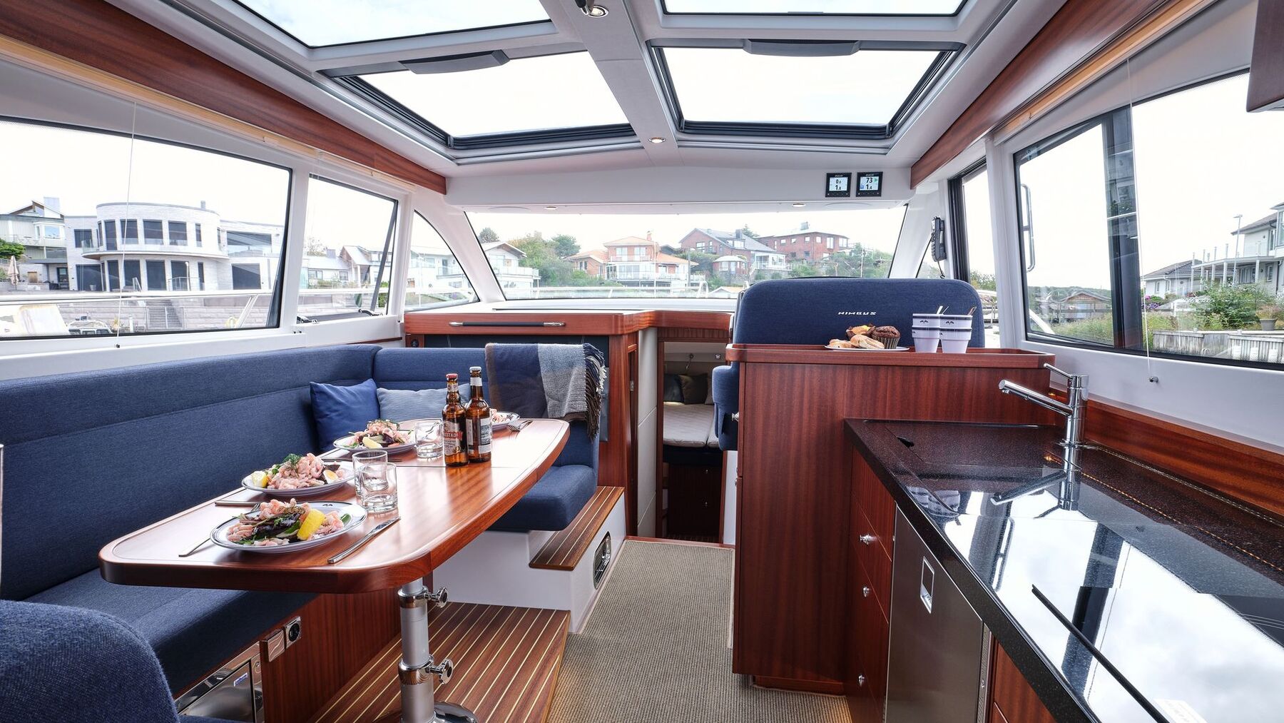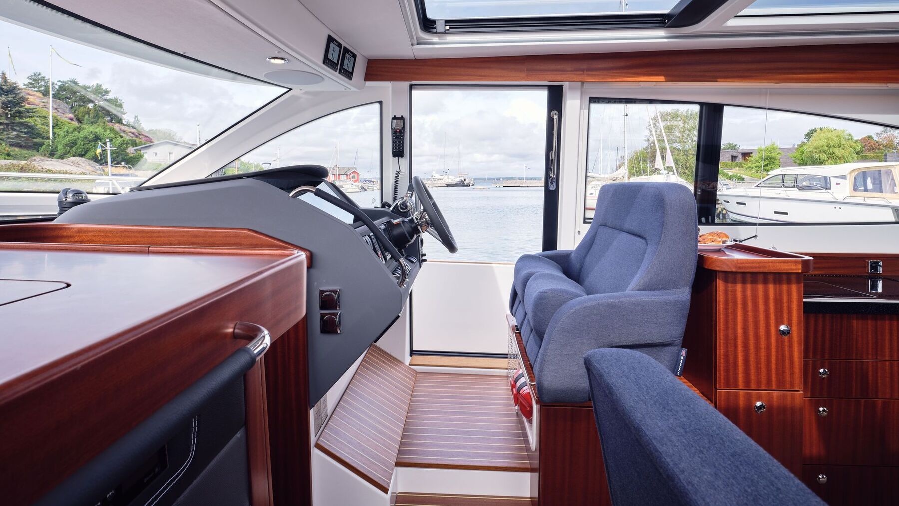 Cockpit: At the helm, the upgraded twin Simrad NSS 12” EVO 3S plotters offer detailed, reliable navigation. The station is further enhanced by a full Simrad autopilot system (including NAC2, OP12 control, rudder feedback, and hydraulic pump), making longer journeys effortless. Visibility is aided by interval wipers. The boat is also fitted with a Volvo Penta trip computer and depth / log instrumentation for essential performance feedback. The wheelhouse has a large aft door, a large sliding aft door to the starboard side deck and a large sliding glass roof with blinds. Port side forward seating and starboard side helm position with 2 person convertible bolster seats for sitting / standing. Port side C shape saloon with table and starboard side galley with gas oven and cooktop, sink, plenty of cupboards + extra Isotherm CR36 box-type 36L fridge - under aft sofa.