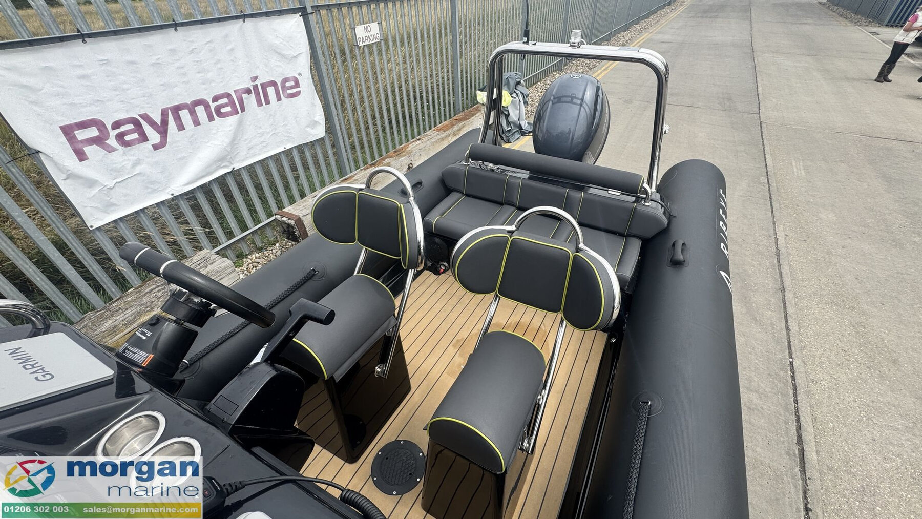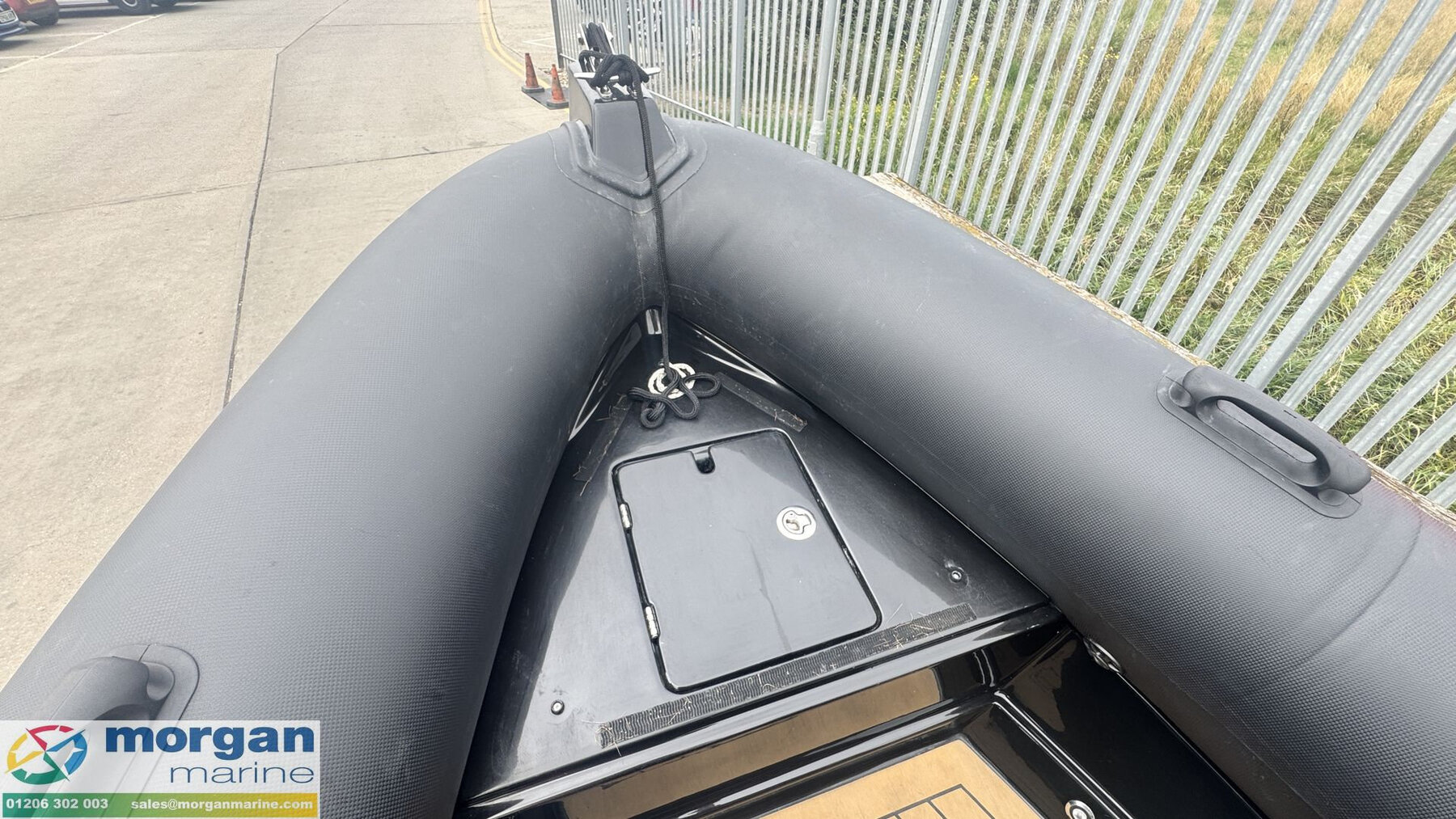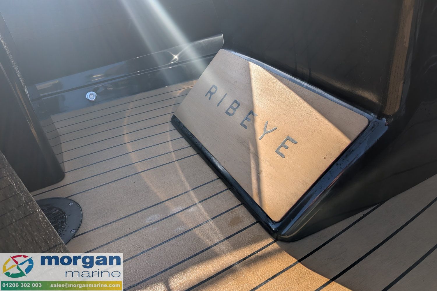 Deck: Black Hypalon tubes. GRP hull. Bow roller. A-frame with tow eye. Ribeye A600 full tailored mooring cover. Mooring cleats on A-frame and bow. Grab handles. Rope handles. Stainless steel fishing rod holder flush mounted. Bathing platform with fold down boarding ladder. Anchor locker with anchor, chain and rope. Teak decking with console footplate. Self draining deck.