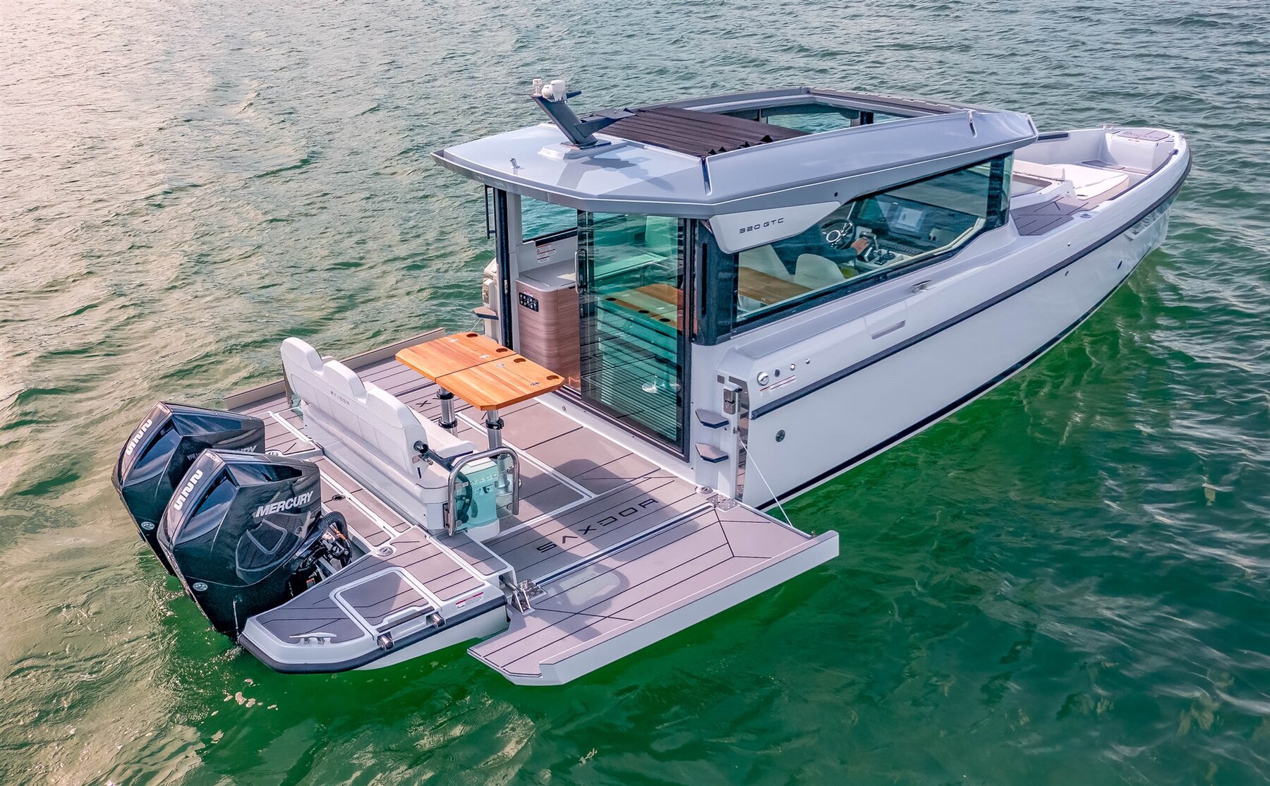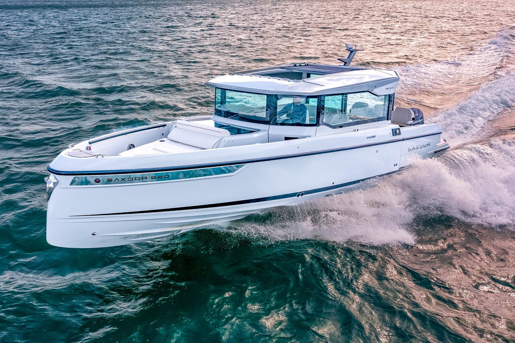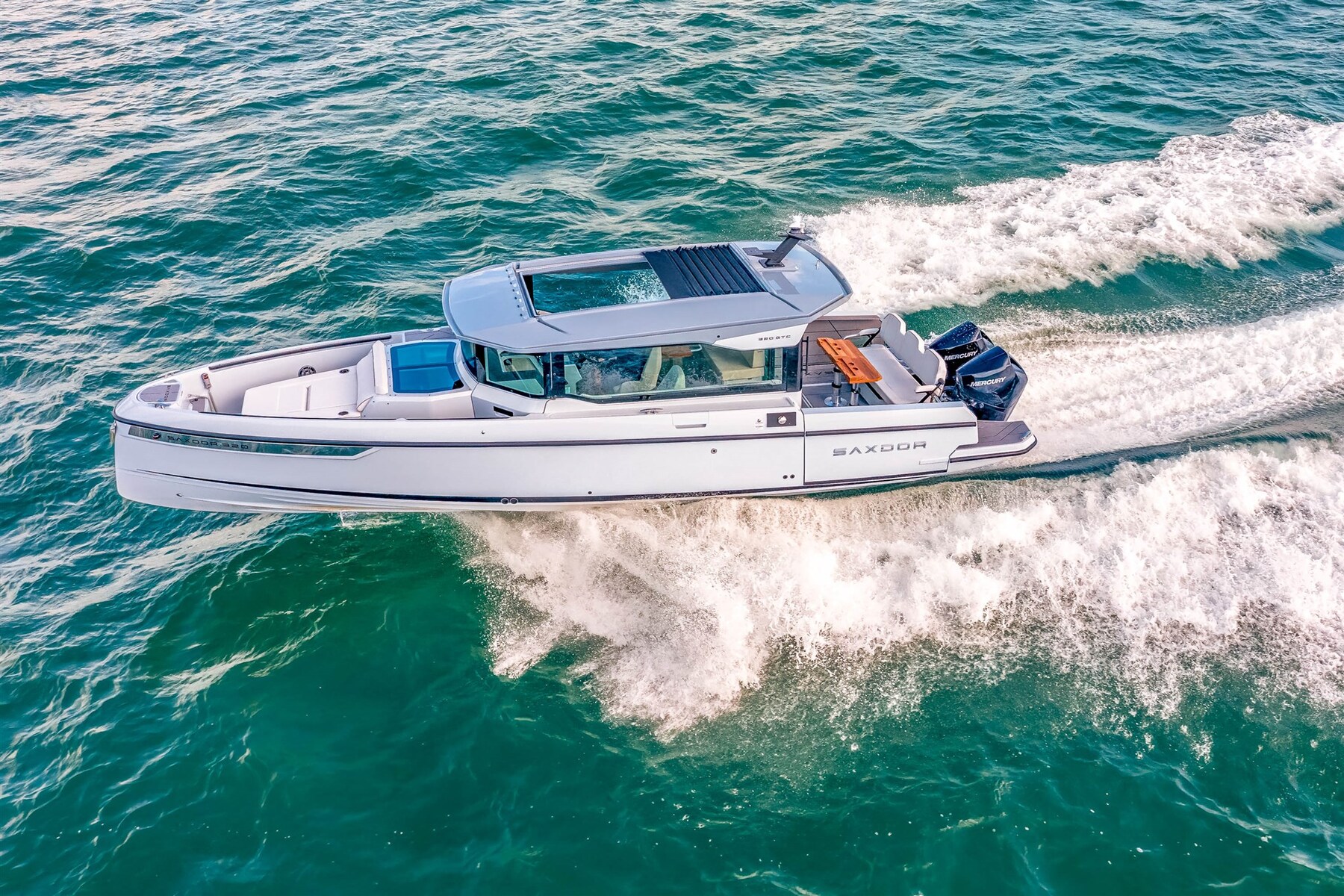 The Saxdor 320 GTC shares the same refined, efficient and performance-oriented hull design as the 320 GTO model. A low center of gravity, low weight, sharp bow and double-step, vacuum-infused hull create a unique driving experience in all types of seas and weather conditions, all over the world. The Saxdor 320 GTC is available with three Mercury powertrain options, ranging from 300 hp to 600 hp. You can choose the single-engine option, or the twin-engine option with 2 x 225 hp or 2 x 300 hp, the true "Grand Turismo of the sea". The Saxdor 320 GTC redefines the on-board experience of movement. Thanks to its unique concept of a spacious full-beam wheelhouse and easy access to the walk-around bow, getting around by boat has never been easier. Saxdor believes in the luxury of unused space. Contact us for every detail.