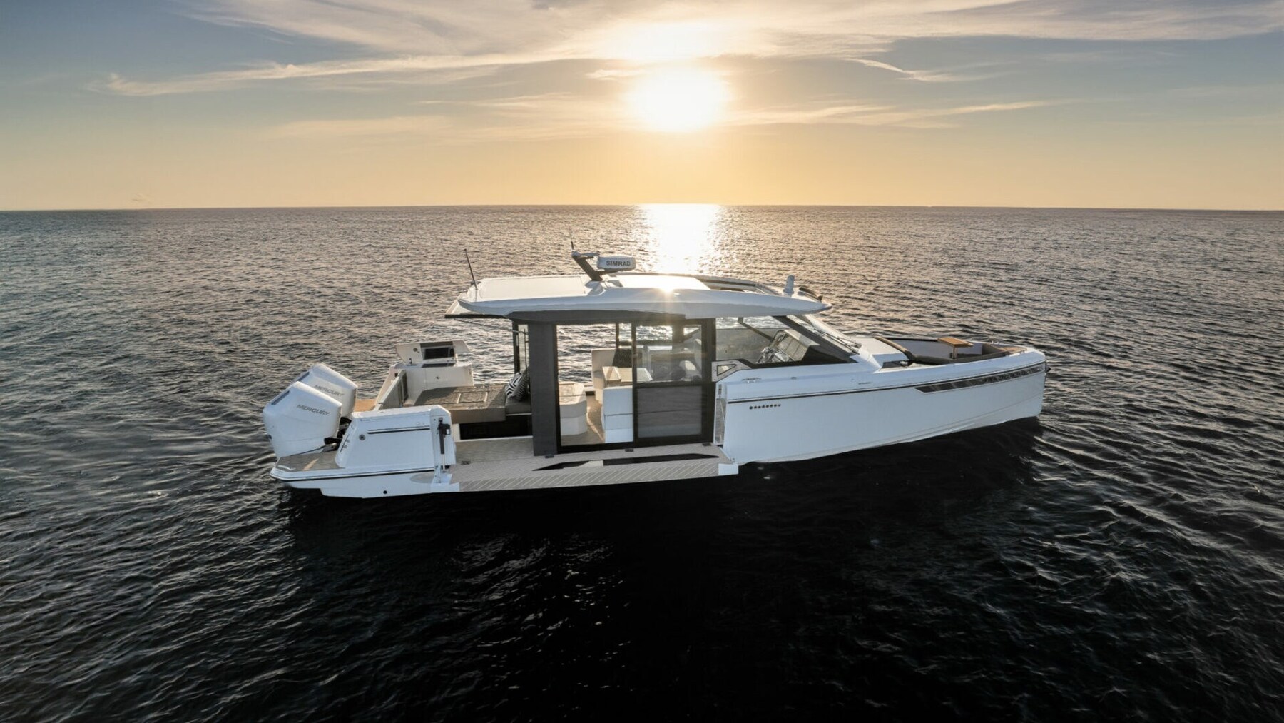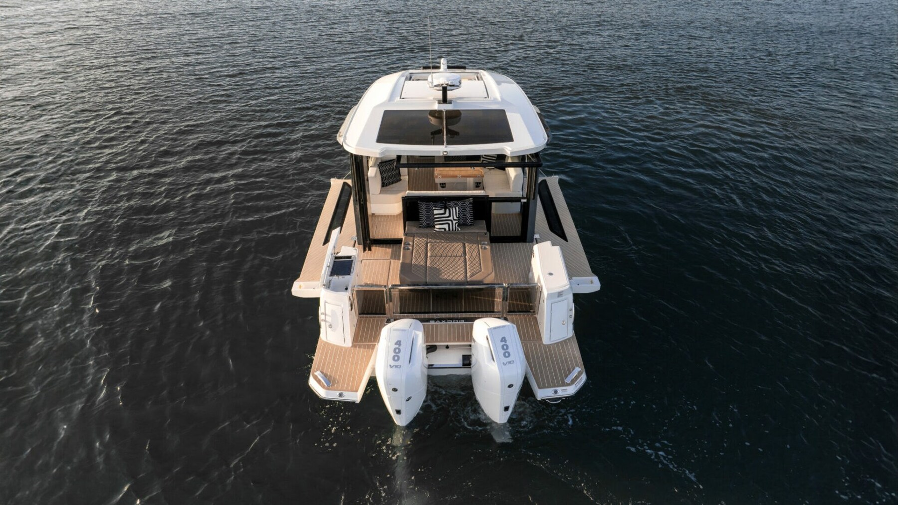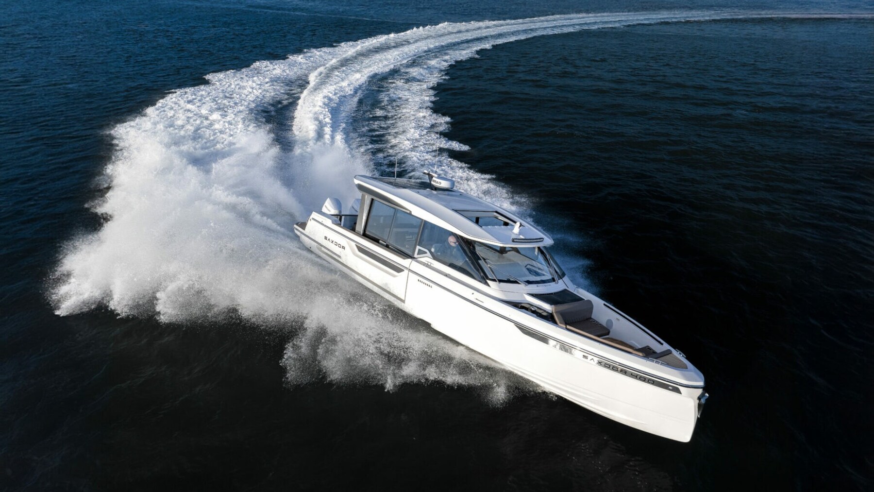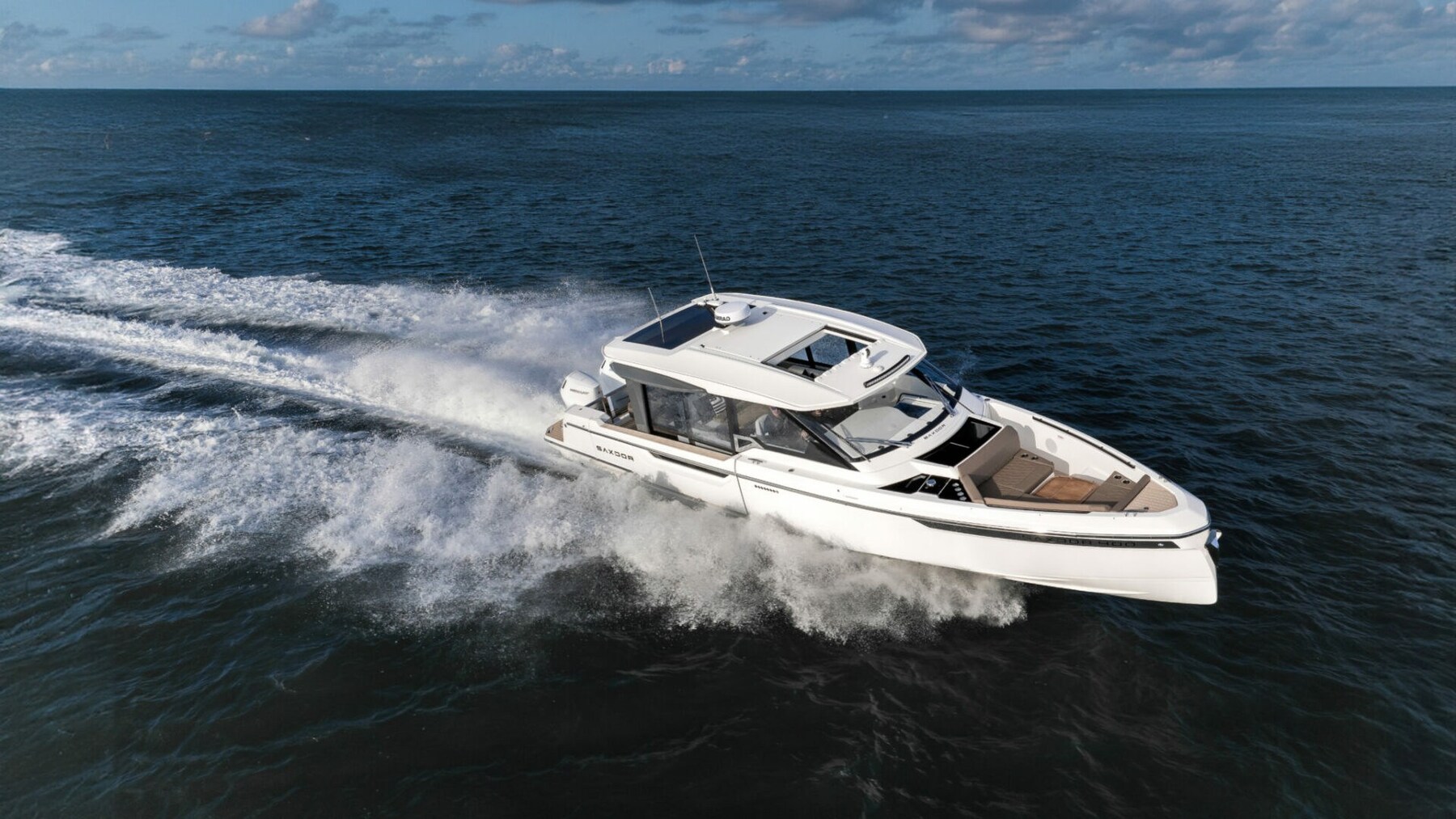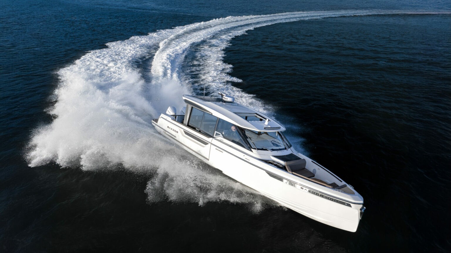 The Saxdor 400 GTC is designed for dual outboard engines and uses an exclusive naval architecture, ensuring a memorable sailing experience. The main deck features an innovative design with a full-width wheelhouse, optimising interior space. Compared to the GTO, the GTC adds a touch of luxury thanks to the large insulated glass surfaces, which create a bright and welcoming environment, protected from the elements. The layout allows for a direct connection to the side terraces, for a relaxation experience similar to a private island. Below deck, two stairs lead to the double cabins – forward and amidships – which share a bathroom; An optional third bed for children is also available. Every detail is designed with elegance and functionality. Contact us for more information.