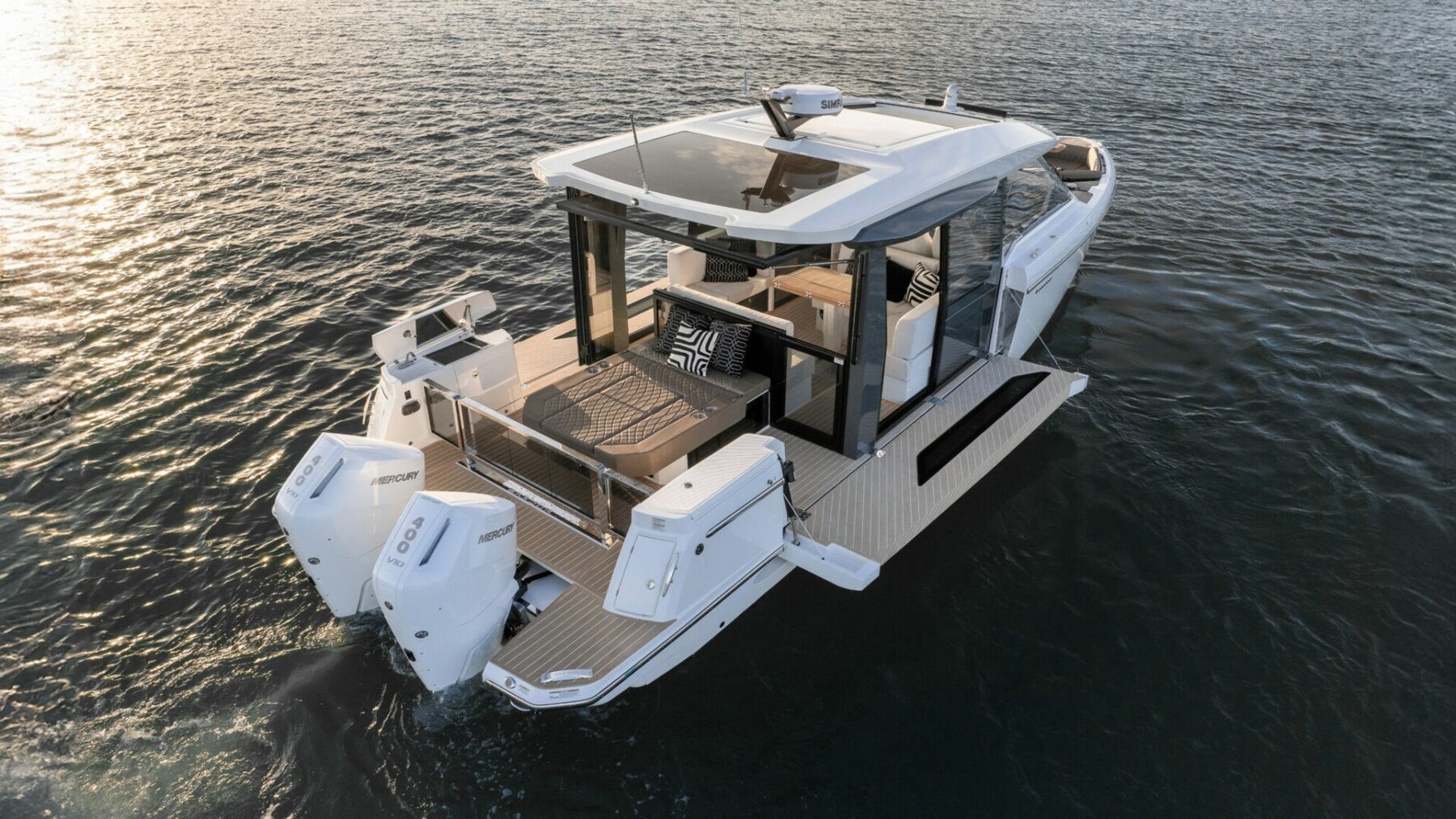 Le Saxdor 400 GTC est conçu pour les deux moteurs hors-bord et utilise une architecture navale exclusive, garantissant une expérience de navigation mémorable. Le pont principal présente un design innovant avec une timonerie pleine largeur, optimisant l’espace intérieur. Par rapport à la GTO, la GTC ajoute une touche de luxe grâce aux grandes surfaces vitrées isolées, qui créent un environnement lumineux et accueillant, à l’abri des intempéries. L’aménagement permet une connexion directe aux terrasses latérales, pour une expérience de détente similaire à une île privée. Sous le pont, deux escaliers mènent aux cabines doubles - à l’avant et au milieu du navire - qui partagent une salle de bain ; Un troisième lit pour les enfants est également disponible en option. Chaque détail est conçu avec élégance et fonctionnalité. Contactez-nous pour plus d’informations.